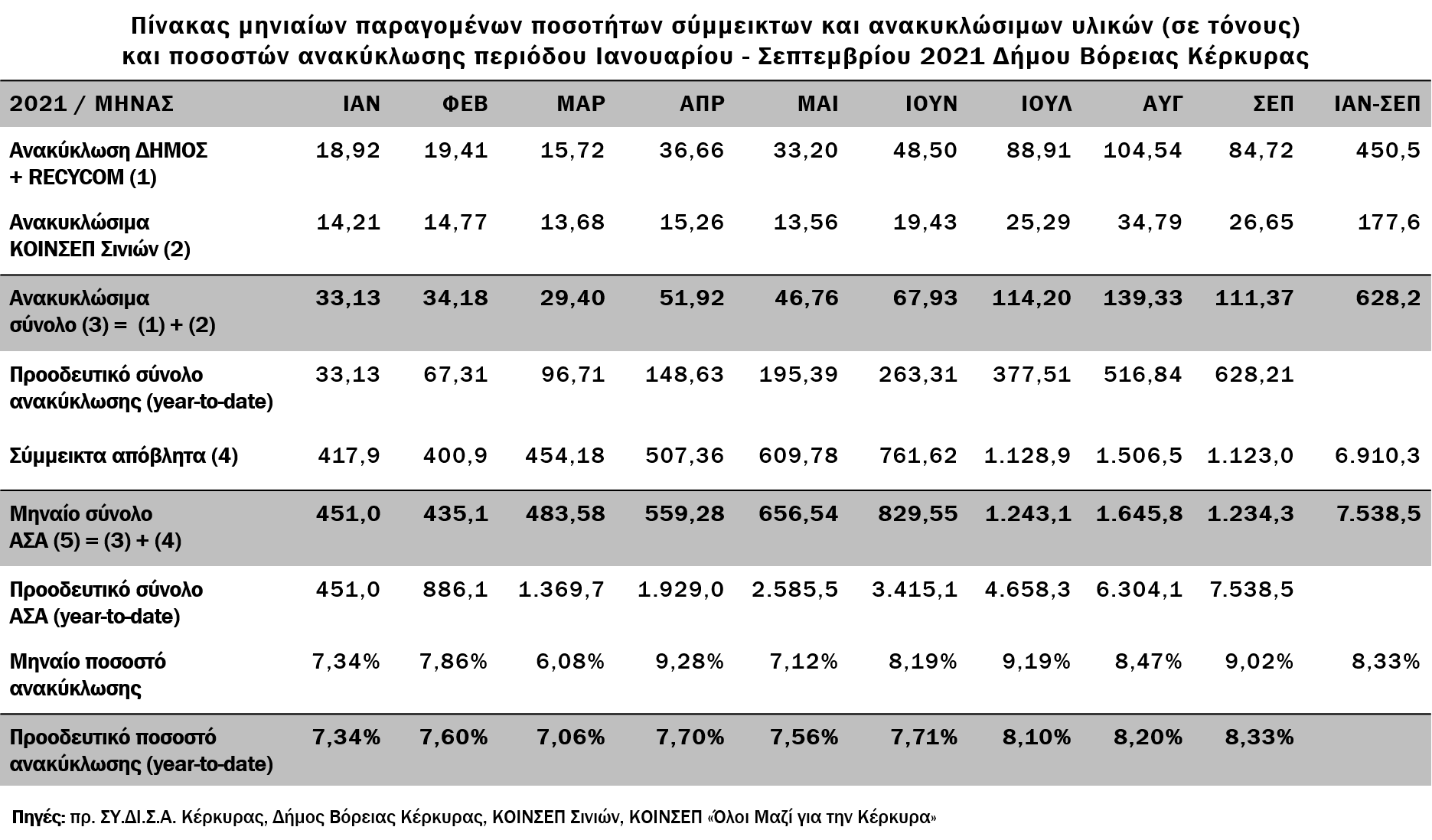Λαμβάνοντας υπόψιν όλα τα παραπάνω και τα στοιχεία του Πίνακα που ακολουθεί με τις καταγραφείσες ποσότητες για το πρώτο 9-μηνο του 2021, το ποσοστό ανακύκλωσης για το 2021 διαμορφώνεται στο 8,33%. Παρατηρείται, δηλαδή, σχεδόν διπλασιασμός του ποσοστού ανακύκλωσης του 2020 και τριπλασιασμός των ποσοτήτων των ανακυκλώσιμων σε απόλυτα μεγέθη. Συνεκτιμώντας τις παραπάνω παρατηρήσεις το πραγματικό ποσοστό ανακύκλωσης για το 2021 εκτιμάται ότι θα κυμανθεί ανάμεσα στο 10.1% και 10.7%. Όπως φαίνεται στον Πίνακα, ένα πολύ ενδιαφέρον στοιχείο είναι η συνεχόμενη αύξηση του ποσοστού ανακύκλωσης κάθε μήνα κατά την διάρκεια του 2021, από 7,34% τον Ιανουάριο ’21 σε 8,33% συνολικά το 9-μηνο Ιανουαρίου-Σεπτεμβρίου ’21. Το γεγονός αποτελεί ένδειξη της δυναμικής που έχει αποκτήσει η κουλτούρα της ανακύκλωσης στο Δήμο Βόρειας Κέρκυρας ως καρπός της ενημέρωσης του δημότη και της σταδιακής ενσωμάτωσης στο δίκτυο του Δήμου περισσότερων νέων «Πράσινων Γωνιών Ανακύκλωσης» και αναμένεται να έχει ως συνέπεια την περαιτέρω αύξηση του ποσοστού ανακύκλωσης στους επόμενους μήνες.