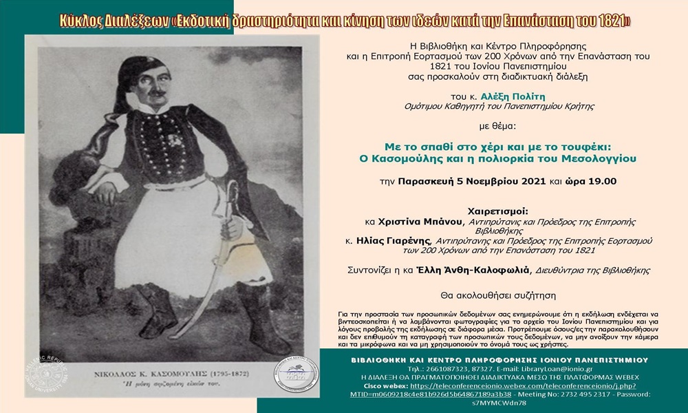 Η Βιβλιοθήκη και Κέντρο Πληροφόρησης και η Επιτροπή Εορτασμού των 200 χρόνων από την Επανάσταση του 1821 του Ιονίου Πανεπιστημίου, στο πλαίσιο του Κύκλου Διαλέξεων με θέμα «Εκδοτική δραστηριότητα και κίνηση των ιδεών κατά την Επανάσταση του 1821», σας προσκαλούν στη διαδικτυακή διάλεξη του κ. Αλέξη Πολίτη, Ομότιμου καθηγητή του Πανεπιστημίου Κρήτης, με θέμα: «Με το σπαθί στο χέρι και με το τουφέκι: Ο Κασομούλης και η πολιορκία του Μεσολογγίου» την Παρασκευή 5 Νοεμβρίου 2021 και ώρα 19.00.