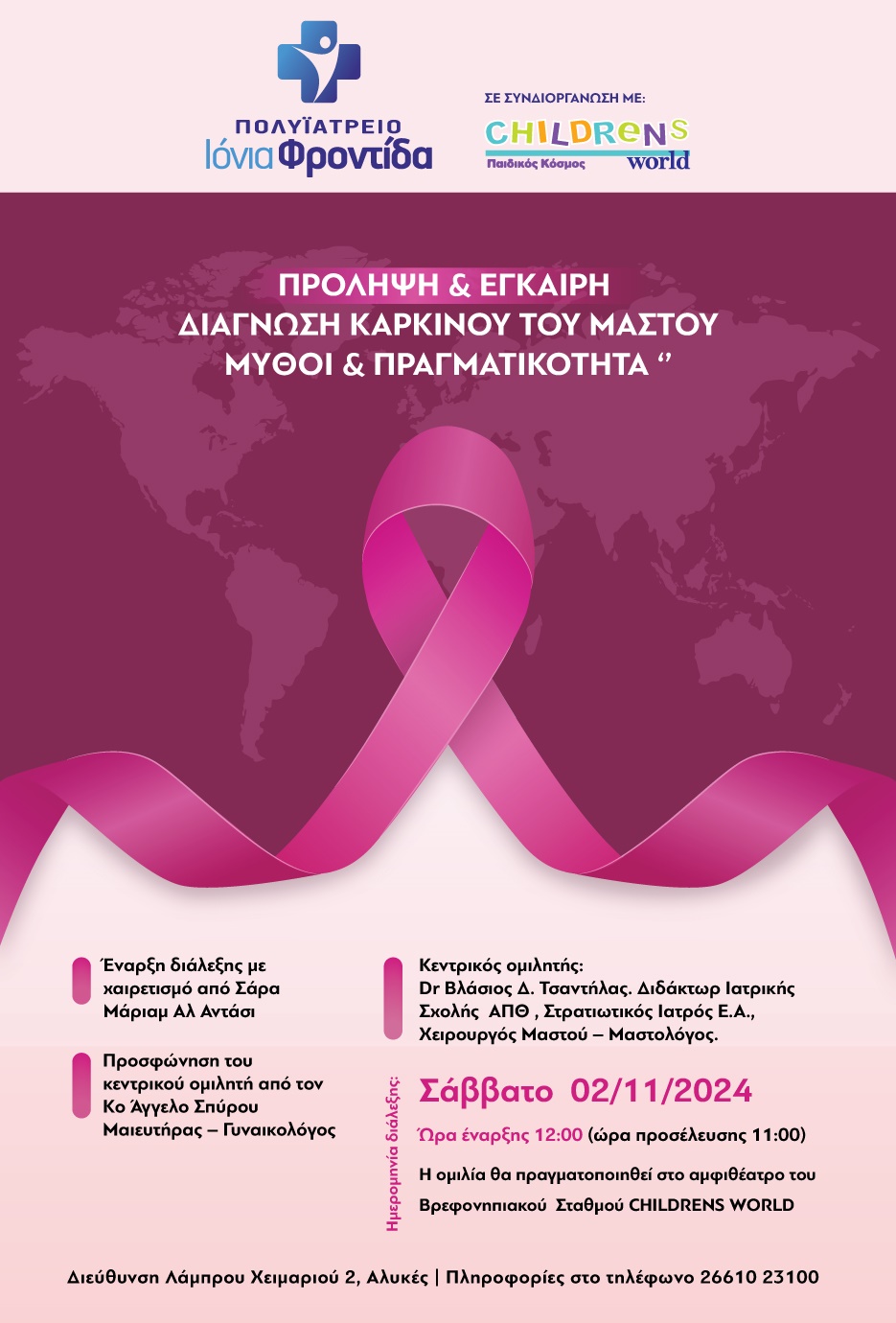 Παγκοσμίως ο καρκίνος του μαστού είναι ο συχνότερος καρκίνος στις γυναίκες. Στην Ελλάδα κάθε χρόνο περίπου 7.500 γυναίκες θα διαγνωσθούν με καρκίνο του μαστού. ΑΛΛΑ, η έγκαιρη διάγνωση και ο τακτικός προληπτικός έλεγχος σώζουν ζωές! Οι σύγχρονες βελτιούμενες θεραπείες έχουν αλλάξει τα δεδομένα.