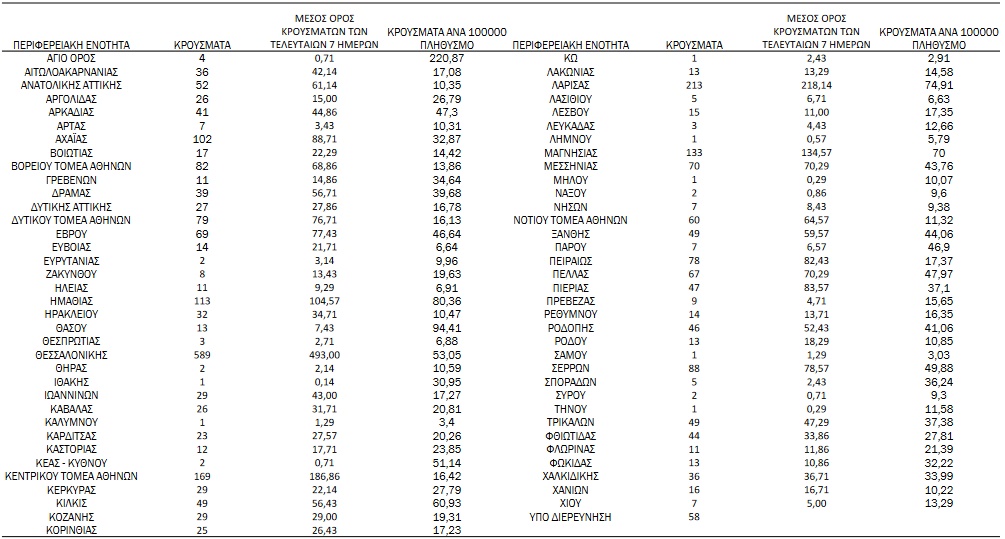 Αναλυτικά, η διασπορά των νέων κρουσμάτων ανά περιφερειακή ενότητα: