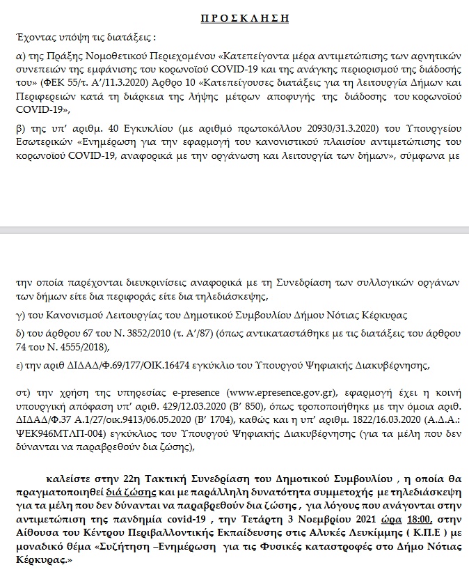 Η συνεδρίαση θα πραγματοποιηθεί δια ζώσης και με παράλληλη δυνατότητα συμμετοχής με τηλεδιάσκεψη στις 6 το απόγευμα.