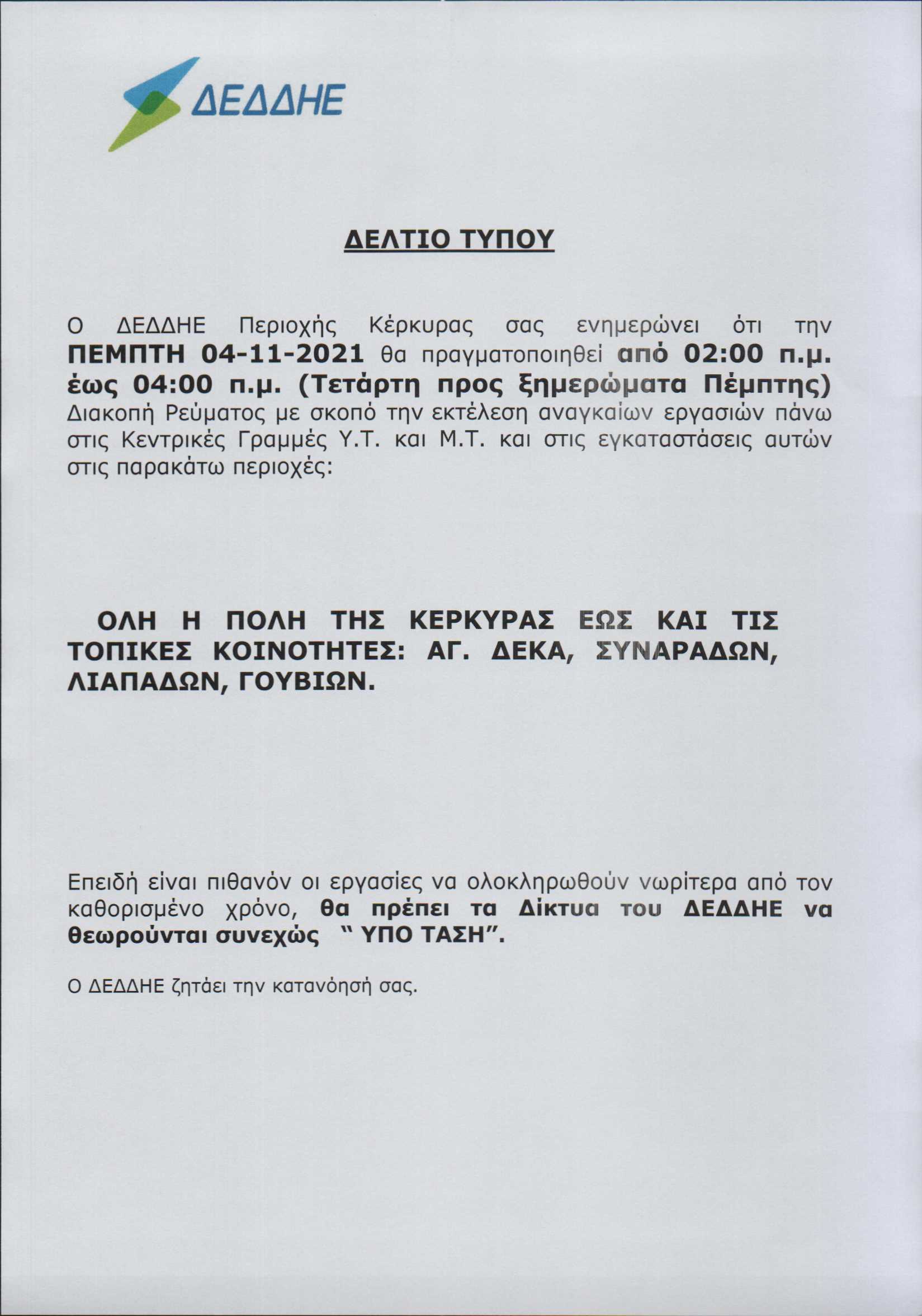 Διακοπή ρεύματος θα πραγματοποιηθεί εκ νέου στην πόλη της Κέρκυρας και σε περιοχές έως τα Γουβιά, τους Λιαπάδες, τους Αγίους Δέκα και τους Σιναράδες τα ξημερώματα της Πέμπτης λόγω εργασιών του ΔΕΔΔΗΕ.