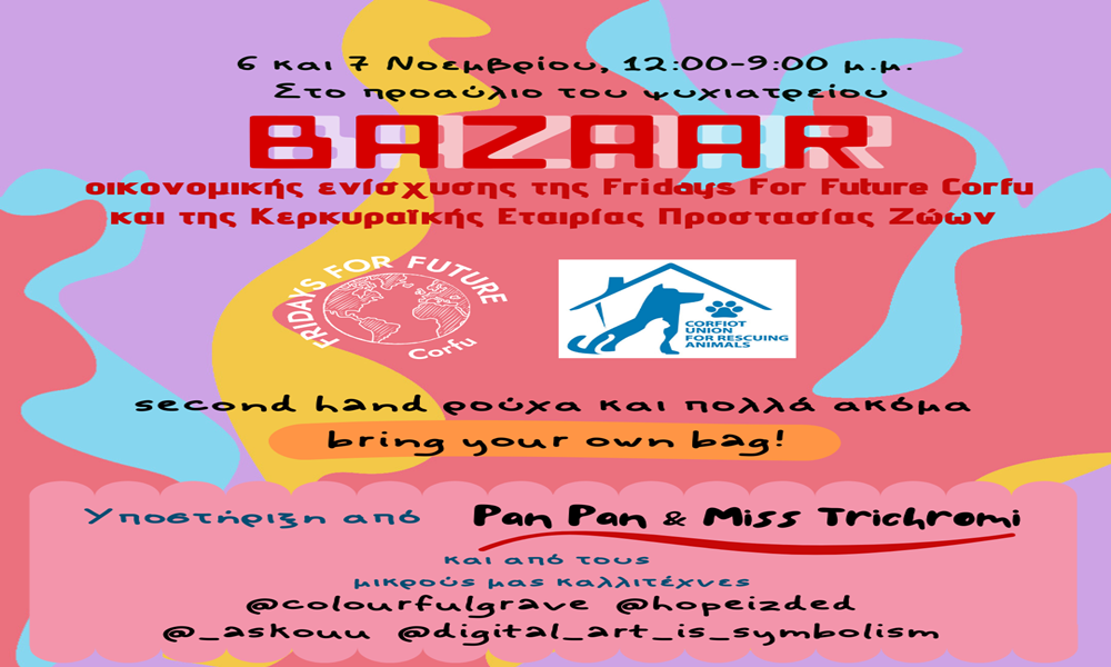 Το Σαββατοκύριακο 6 και 7 Νοεμβρίου στον Πανεπιστημιακό χώρο του Παλαιού Ψυχιατρείου από τις 12 το μεσημέρι έως τις 9 το βράδυ, η ομάδα Fridays For Future Corfu θα διοργανώσει bazaar με ρούχα από δεύτερο χέρι, υποστηρίζοντας παράλληλα μικρούς καλλιτέχνες μέσω της προώθησης των δημιουργιών τους.