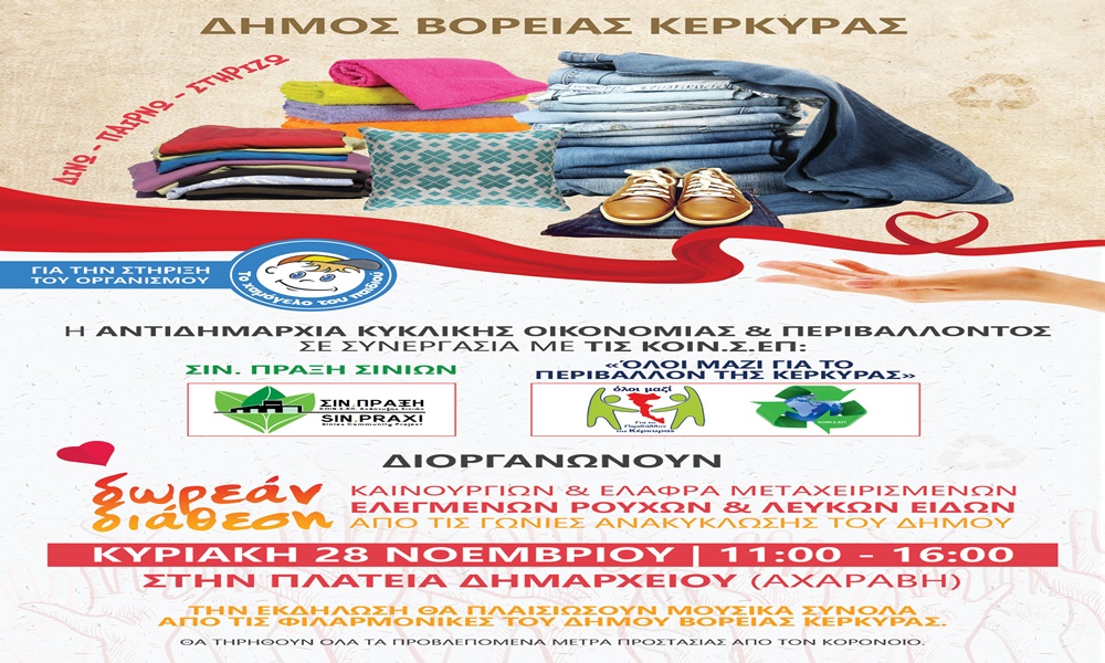 Η Αντιδημαρχία Κυκλικής Οικονομίας, Περιβάλλοντος και Δημοσίων Σχέσεων Δήμου Βόρειας Κέρκυρας σε συνεργασία με τις ΚΟΙΝ.Σ.ΕΠ : «ΣΙΝ.ΠΡΑΞΗ ΣΙΝΙΩΝ» και «ΟΛΟΙ ΜΑΖΙ ΓΙΑ ΤΟ ΠΕΡΙΒΑΛΛΟΝ ΤΗΣ ΚΕΡΚΥΡΑΣ» συνδιοργανώνουν εκδήλωση για ΔΩΡΕΑΝ ΔΙΑΘΕΣΗ καινούργιων και ελαφρά μεταχειρισμένων ελεγμένων ρούχων και λευκών ειδών από τις γωνιές ανακύκλωσης του Δήμου Βόρειας Κέρκυρας.