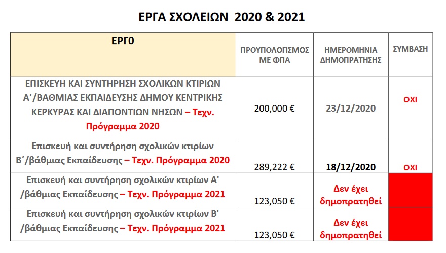 Από το Τεχνικό Πρόγραμμα του 2020, με κρατική χρηματοδότηση, δημοπρατήθηκαν τον Δεκέμβριο του 2020 η επισκευή και η συντήρηση κτιρίων Α’/βαθμιας εκπαίδευσης (200.000 €) και Β! βαθμιας εκπαίδευσης ( 289.220 €), αλλά ακόμα και μέχρι σήμερα δεν έχουν συμβασιοποιηθεί με αποτέλεσμα τα χρήματα να παραμένουν αναξιοποίητα, ενώ η κατάσταση των σχολικών υποδομών είναι επιεικώς απαράδεκτη.