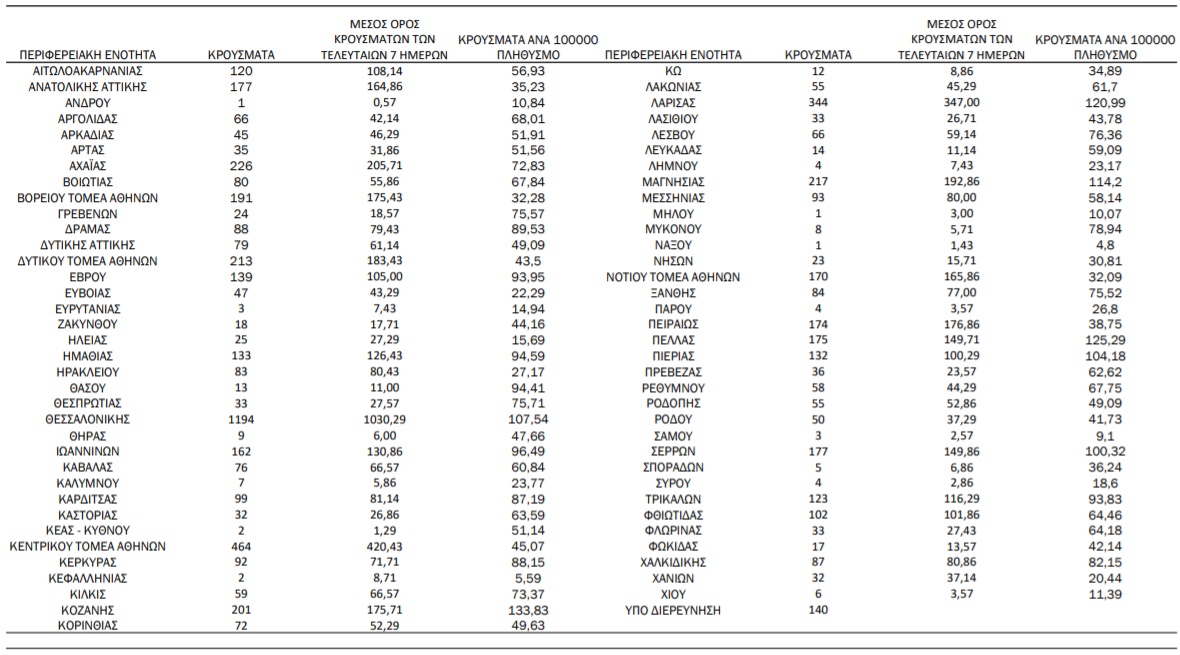 Αναλυτικά, η διασπορά των νέων κρουσμάτων ανά περιφερειακή ενότητα: