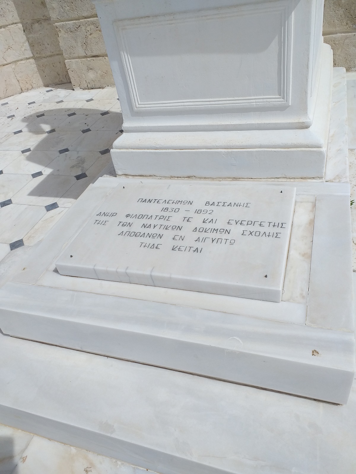 ορθογώνιου σχήματος βάθρο, όχι ψηλό ( 1,44 μ. συνολικά μαζί με τους αναβαθμούς) ,από το ίδιο υλικό με το γλυπτό και λιτής πλην καλαίσθητης όψης. Στην ένθετη , επίσης μαρμάρινη, πλακέτα, που υπάρχει σε κατώτερο σημείο μπροστά από το βάθρο, σημειώνονται με εγχάρακτα κεφαλαία γράμματα τα ακόλουθα : ΠΑΝΤΕΛΕΗΜΩΝ ΒΑΣΣΑΝΗΣ / 1830-1892 / ΑΝΗΡ ΦΙΛΟΠΑΤΡΙΣ ΤΕ ΚΑΙ ΕΥΕΡΓΕΤΗΣ / ΤΗΣ ΤΩΝ ΝΑΥΤΙΚΩΝ ΔΟΚΙΜΩΝ ΣΧΟΛΗΣ / ΑΠΟΘΑΝΩΝ ΕΝ ΑΙΓΥΠΤΩ / ΤΗΔΕ ΚΕΙΤΑΙ. Η επιλογή της τοποθέτησης του έργου σε αμφιθεατρικό σημείο υποσκελίζει παρόλα αυτά τον όχι ιδιαίτερα μεγάλο όγκο του και έτσι αναδεικνύεται αβίαστα στον ευρύ περιβάλλοντα χώρο.