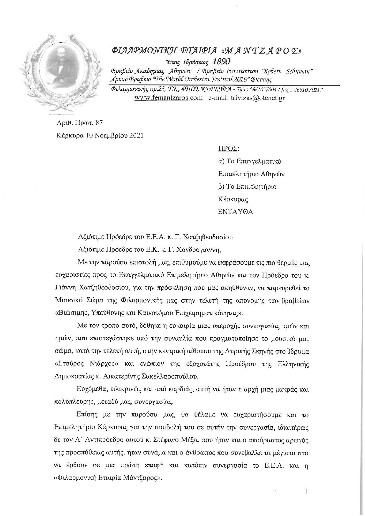 ΕΛΕΥΘΕΡΟΕΙΔΗΣΕΙΣΑΝΑΚΟΙΝΩΣΕΙΣ Η “Μάντζαρος” ευχαριστεί τα Επιμελητήρια Αθήνας και Κέρκυρας Ευχαριστήρια επιστολή της ΦΕ "Μάντζαρος" προς το Επιμελητήριο Αθηνών και το Επιμελητήριο Κέρκυρας Last updated: 16/11/2021 09:51 CorfuPress.com Published: 16/11/2021 Share SHARE Ευχαριστήρια επιστολή της ΦΕ “Μάντζαρος” προς το Επιμελητήριο Αθηνών και το Επιμελητήριο Κέρκυρας Το Επιμελητήριο ζητά παράταση/αναβολή της διαβούλευσης για τον Κανονισμό Λειτουργίας Π. Πόλης Το Επιμελητήριο ζητά παράταση/αναβολή της διαβούλευσης για τον Κανονισμό Λειτουργίας Π. Πόλης Το Επιμελητήριο ζητά παράταση/αναβολή της διαβούλευσης για τον Κανονισμό Λειτουργίας Π. Πόλης Καλούδης: Το Επιμελητήριο έχει καταντήσει εργαλείο μικροεξυπηρετήσεων και σπατάλης Επιστολή του Επιμελητηρίου προς την ΚΕΕΕ για την πλατφόρμα “Καταγγελίες Πολιτών” Share This Article Facebook Whatsapp Whatsapp Email Copy Link Print Previous Article Αφιερωμένοι στη μνήμη του Σπύρου Καρπατσέλη και του Βασίλη Σεβαστή οι αγώνες δρόμου “Φιλίας και Αγάπης” Next Article Εκπαιδεύτηκαν στη χρήση του απινιδωτή οι δικηγόροι Δεν υπάρχουν Σχόλια Δεν υπάρχουν Σχόλια Αφήστε μια απάντηση Ακύρωση απάντησηςΗ ηλ. διεύθυνση σας δεν δημοσιεύεται. Τα υποχρεωτικά πεδία σημειώνονται με *Σχόλιο * Όνομα * Email * Ιστότοπος Αποθήκευσε το όνομά μου, email, και τον ιστότοπο μου σε αυτόν τον πλοηγό για την επόμενη φορά που θα σχολιάσω. ΑναζήτησηΑναζήτησηRecent PostsΌλα τα μάτια στον Θοδωρή, τον καπετάνιο μας! Τη Δευτέρα 22 Σεπτεμβρίου γιορτάζει… Σαν Σήμερα 22/9: Τα σημαντικότερα γεγονότα… Η πρόγνωση του καιρού Έφηβοι Ιονίου: Με περίπατο, συνεχίζουν στο Rising Stars! Recent CommentsΧωρίς σχόλια για εμφάνιση.