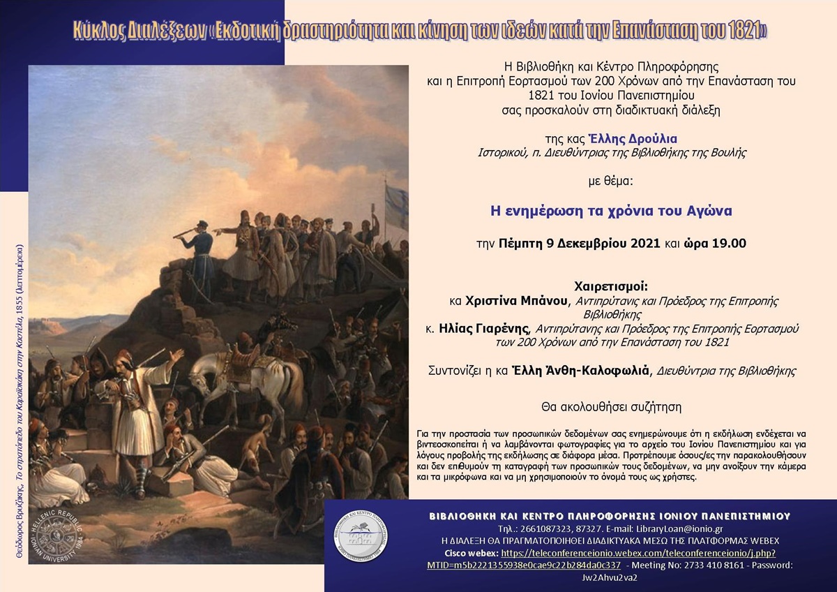 Η Βιβλιοθήκη και Κέντρο Πληροφόρησης και η Επιτροπή Εορτασμού των 200 χρόνων από την Επανάσταση του 1821 του Ιονίου Πανεπιστημίου, στο πλαίσιο του Κύκλου Διαλέξεων με θέμα «Εκδοτική δραστηριότητα και κίνηση των ιδεών κατά την Επανάσταση του 1821», σας προσκαλούν στη διαδικτυακή διάλεξη της κας Έλλης Δρούλια, Ιστορικού και π. Διευθύντριας της Βιβλιοθήκης της Βουλής, με θέμα: «Η ενημέρωση τα χρόνια του Αγώνα» την Πέμπτη 9 Δεκεμβρίου 2021 και ώρα 19.00.