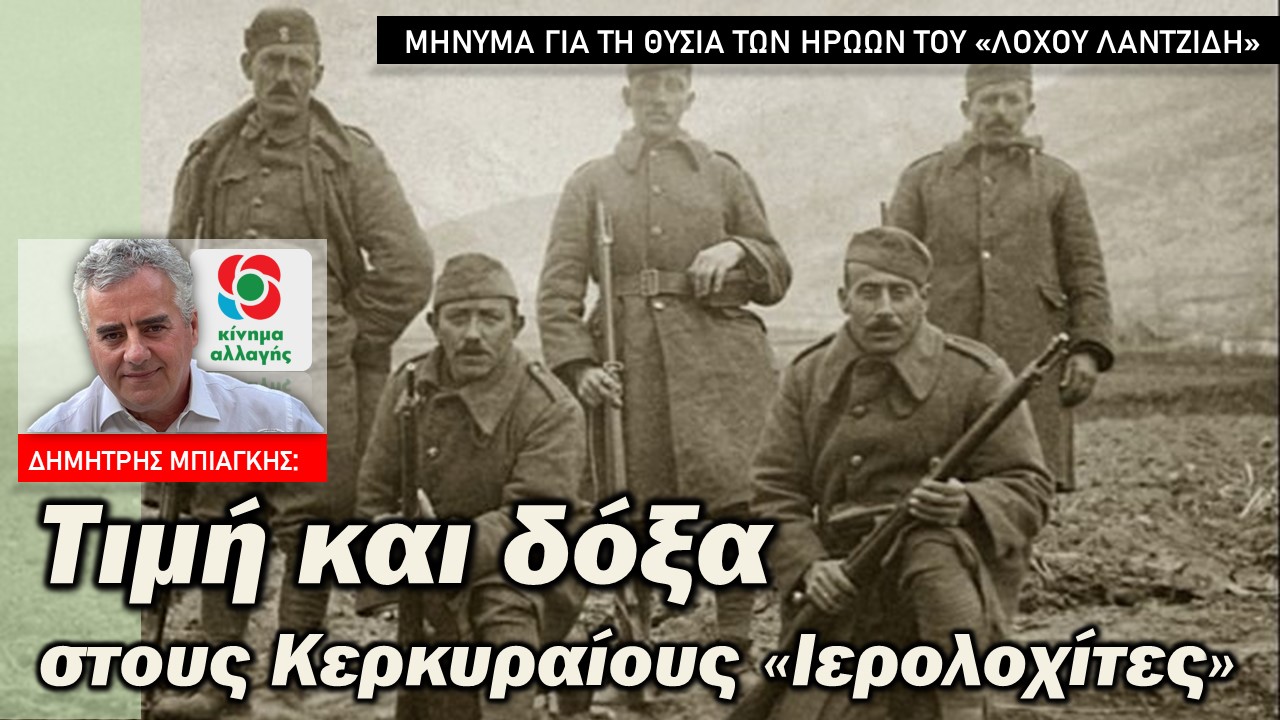 Σήμερα, οφείλουμε να θυμηθούμε τη θυσία εκείνων των Κερκυραίων μαχητών που πρόταξαν τα στήθη τους ενάντια στην απειλή του φασιμού, πρόσφεραν απλόχερα τη ζωή τους για τη λευτεριά της πατρίδας και την αξιοπρέπεια του αδούλωτου λαού μας. Να θυμηθούμε όσους θυσιάστηκαν αλλά κι όσους αιχμαλωτίστηκαν, για τους οποίους ακολούθησε μια ατέλειωτη οδύσσεια στα νοσοκομεία και τα στρατόπεδα της Ιταλίας, στις χαράδρες των Ιταλικών Άλπεων, στα ανθρακωρυχεία της Σαρδηνίας, στους καταυλισμούς προσφύγων στην Ελβετία, στους δρόμους του γυρισμού, στον καθημερινό μόχθο και τις διώξεις για την επιβίωση μετά την επιστροφή τους στην πατρίδα. Να θαυμάσουμε τον ηρωισμό και την αυταπάρνησή τους, αποτίοντας τον απαραίτητο φόρο τιμής στο ανδραγάθημά τους. Ο λόχος «Λαντζίδη», που οι άνδρες του ήταν το άνθος της κερκυραϊκής νεολαίας, δικαίως έχει περάσει στο θρύλο και στη συνείδηση των Κερκυραίων ως «Λόχος Θανάτου». Η δική τους ηρωική θυσία αποτελεί την ωραιώτερη ωδή στην ίδια τη ζωή. Οφείλουν οι τοπικοί μας φορείς να αναλάβουν σχετικές πρωτοβουλίες, ώστε να τιμηθεί δεόντως η θυσία αυτών των ανθρώπων με την ανέγερση ενός μνημείου στο παλιό λιμάνι της Κέρκυρας.