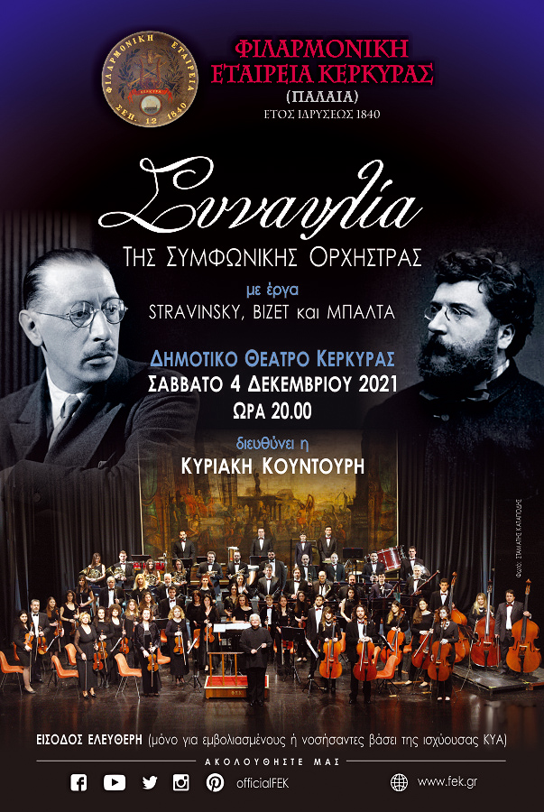 Η Φιλαρμονική Εταιρεία Κερκύρας πιστή στη δέσμευσή της για συνέχιση του καλλιτεχνικού έργου της μέσα στις πρωτόγνωρες συνθήκες της πανδημίας συνεχίζει τη συναυλιακή δραστηριότητά της παρουσιάζοντας τη φορά αυτή την Συμφωνική Ορχήστρα της. Πρόκειται για τη συναυλία που θα πραγματοποιηθεί στο Δημοτικό Θέατρο της πόλης μας το Σάββατο, 4 Δεκεμβρίου 2021 και ώρα 20:00. Σε αυτήν θα παρουσιαστούν έργα του Igor Stravinsky, George Bizet και Άλκη Μπαλτά. Την ορχήστρα της Παλαιάς Φιλαρμονικής θα διευθύνει η νεαρή αρχιμουσικός Κυριακή Κουντούρη, βοηθός του αρχιμουσικού Άλκη Μπαλτά.