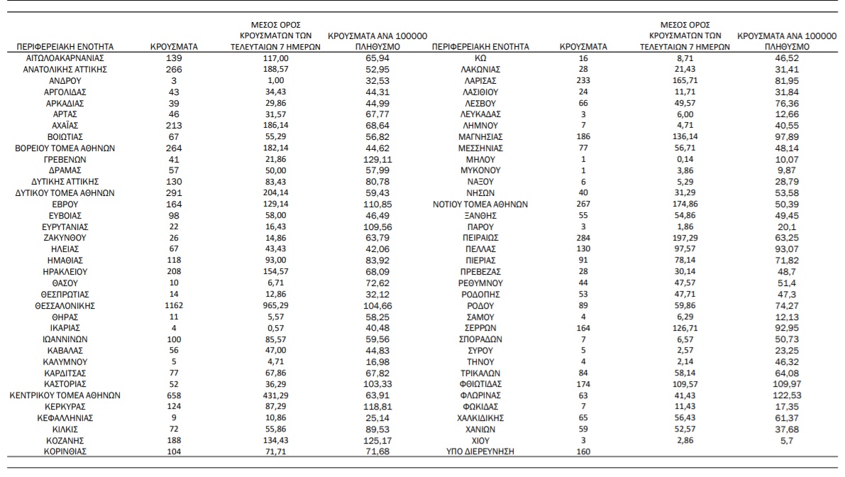 Αναλυτικά, η διασπορά των νέων κρουσμάτων ανά περιφερειακή ενότητα: