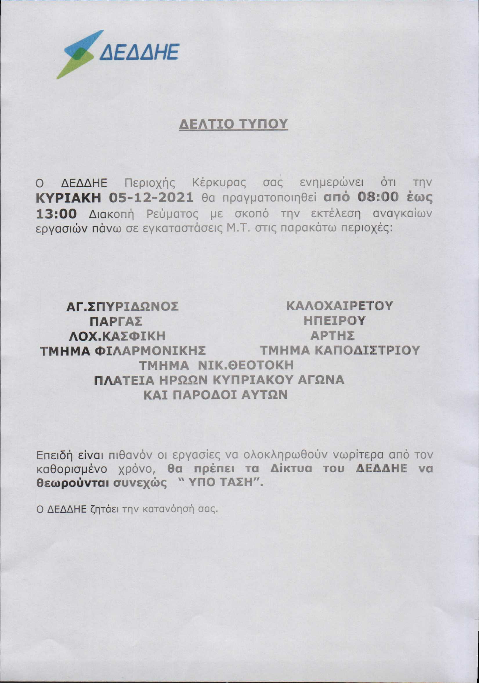 Χωρίς ρεύμα θα μείνουν από το πρωί έως το μεσημέρι της Κυριακής αρκετές περιοχές της παλιάς πόλης της Κέρκυρας λόγω εργασιών του ΔΕΔΔΗΕ.