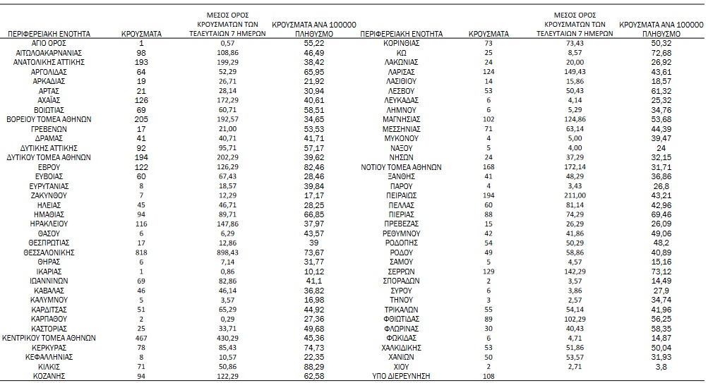 Αναλυτικά, η διασπορά των νέων κρουσμάτων ανά περιφερειακή ενότητα: