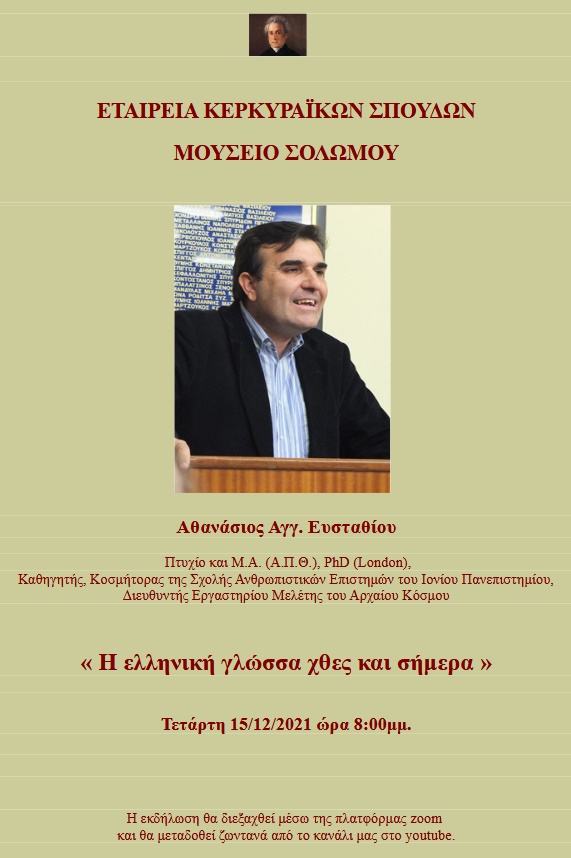 Η Εταιρεία Κερκυραϊκών Σπουδών διοργανώνει ομιλία του Αθανασίου Αγγ. Ευσταθίου, Καθηγητη, Κοσμήτορα της Σχολής Ανθρωπιστικών Επιστημών του Ιονιου Πανεπιστημιου, Διευθυντή Εργαστηρίου Μελέτης του Αρχαίου Κόσμου.