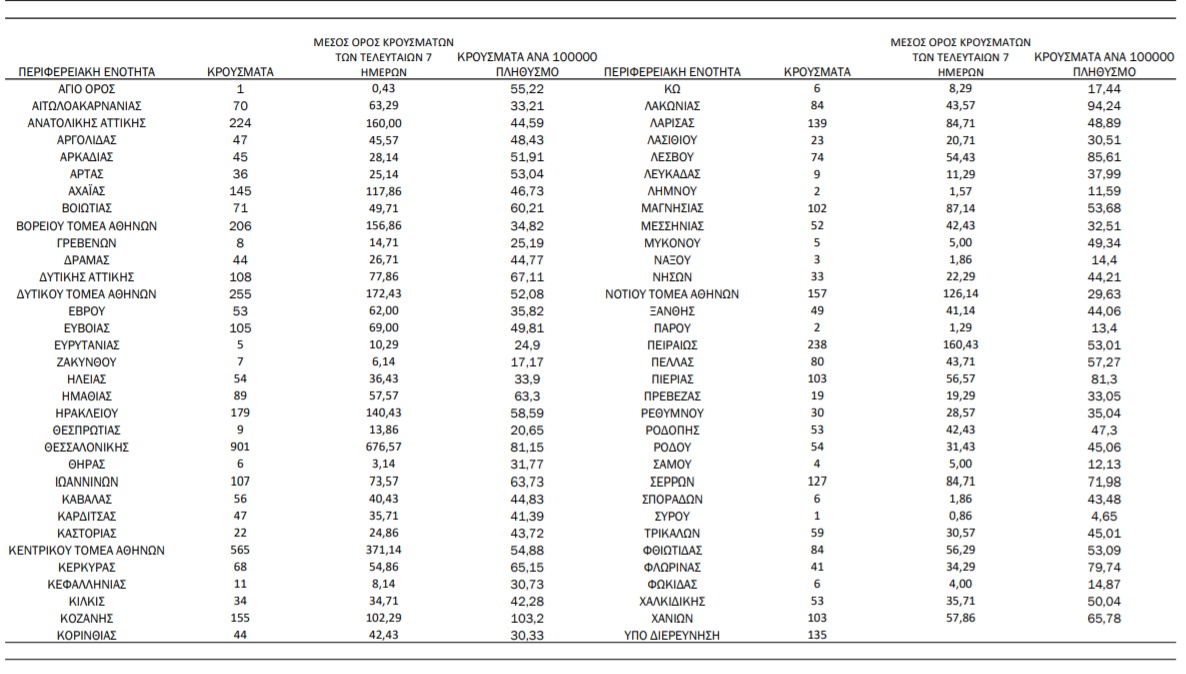 Αναλυτικά, η διασπορά των νέων κρουσμάτων ανά περιφερειακή ενότητα: