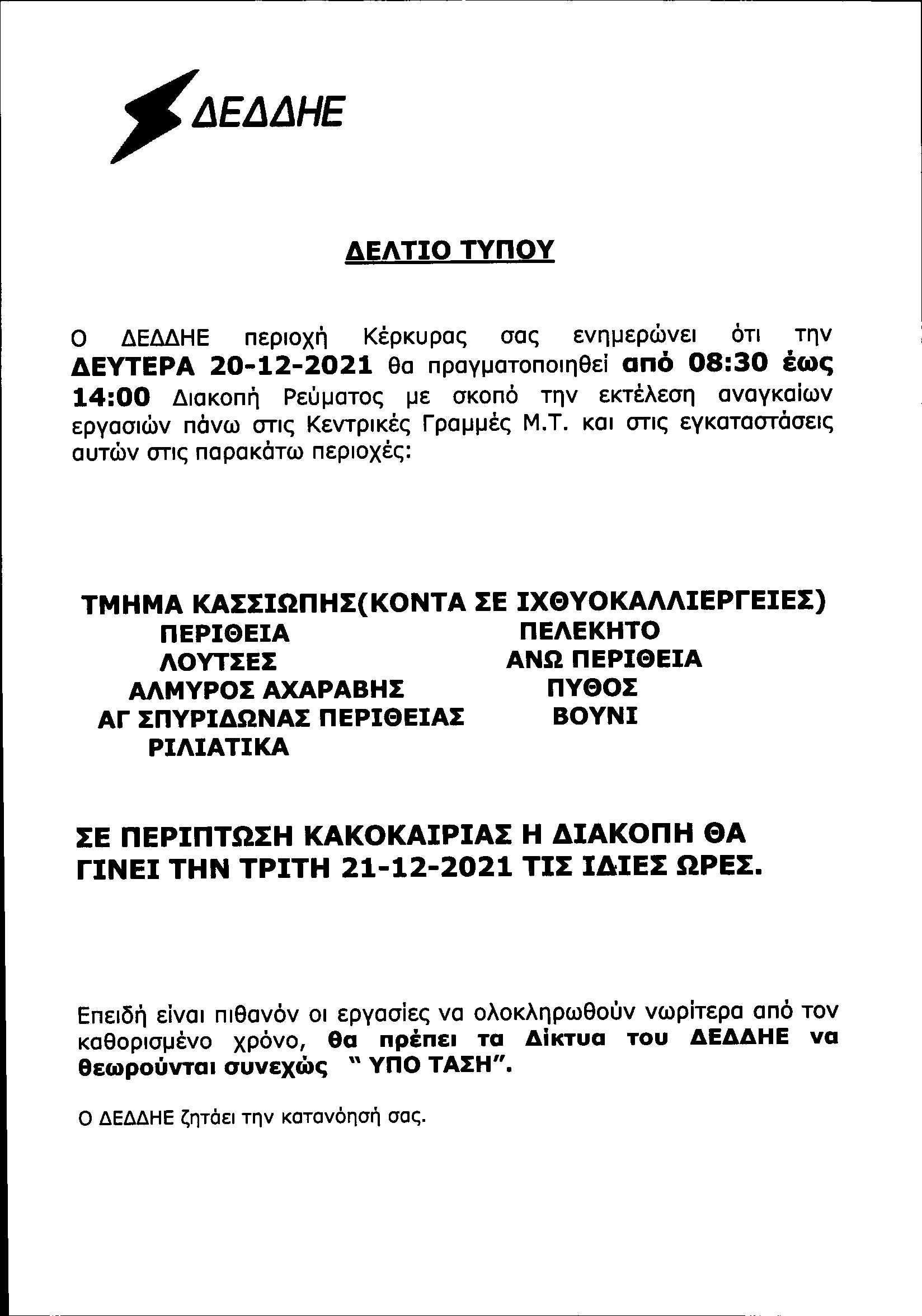 ΚΟΙΝΩΝΙΑΕΛΕΥΘΕΡΟΕΙΔΗΣΕΙΣ Διακοπή ρεύματος τη Δευτέρα σε περιοχές της βόρειας Κέρκυρας Η διακοπή θα πραγματοποιηθεί λόγω εργασιών του ΔΕΔΔΗΕ στις κεντρικές γραμμές Μεσαίας Τάσης. Last updated: 17/12/2021 10:56 CorfuPress.com Published: 17/12/2021 Share SHARE Η διακοπή θα πραγματοποιηθεί λόγω εργασιών του ΔΕΔΔΗΕ στις κεντρικές γραμμές Μεσαίας Τάσης. Διακοπή ρεύματος τη Δευτέρα-Δείτε που Που θα γίνει διακοπή ρεύματος την Τετάρτη Που θα γίνει διακοπή ρεύματος την Τετάρτη Που θα γίνουν προγραμματισμένες διακοπές ρεύματος το διάστημα 23-25 Αυγούστου Έρχεται διακοπή ρεύματος στη Βόρεια Κέρκυρα Share This Article Facebook Whatsapp Whatsapp Email Copy Link Print Previous Article Σερεμέτης: Ενισχύεται ο στόλος οχημάτων – Έκκληση ανακύκλωσης στην πηγή Next Article Μπιάγκης: Ο Προϋπολογισμός είναι ενάντια στους «ανθρώπους» και εξυπηρετεί μόνο αριθμούς και πλεονάσματα (video) Δεν υπάρχουν Σχόλια Δεν υπάρχουν Σχόλια Αφήστε μια απάντηση Ακύρωση απάντησηςΗ ηλ. διεύθυνση σας δεν δημοσιεύεται. Τα υποχρεωτικά πεδία σημειώνονται με *Σχόλιο * Όνομα * Email * Ιστότοπος Αποθήκευσε το όνομά μου, email, και τον ιστότοπο μου σε αυτόν τον πλοηγό για την επόμενη φορά που θα σχολιάσω. ΑναζήτησηΑναζήτησηRecent PostsΌλα τα μάτια στον Θοδωρή, τον καπετάνιο μας! Τη Δευτέρα 22 Σεπτεμβρίου γιορτάζει… Σαν Σήμερα 22/9: Τα σημαντικότερα γεγονότα… Η πρόγνωση του καιρού Έφηβοι Ιονίου: Με περίπατο, συνεχίζουν στο Rising Stars! Recent CommentsΧωρίς σχόλια για εμφάνιση.