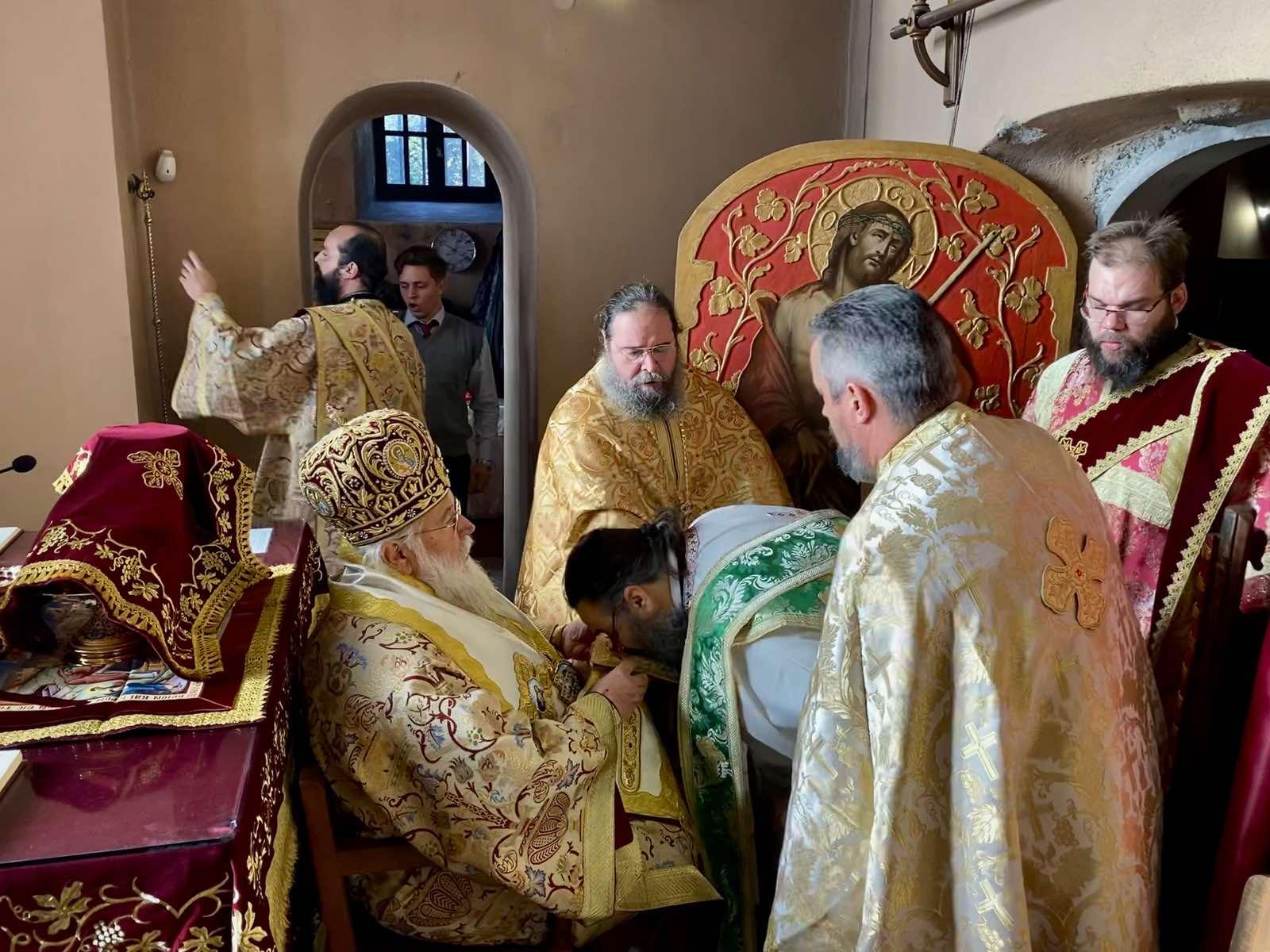 Κατά την Θεία λειτουργία ο Σεβασμιώτατος τέλεσε την εις πρεσβύτερον χειροτονία του ιεροδιακόνου Χρήστου Βραχλιώτη, έγγαμου και πατέρα δύο παιδιών. Ο π. Χρήστος έχει τελειώσει την οδοντοιατρική σχολή στο Βουκουρέστι, αλλά ποτέ δεν εξάσκησε το επάγγελμα διότι η κλίση του και η αγάπη του για τον Θεό, τον οδήγησε στην εκκλησία. Ο Σεβασμιώτατος κατά την χειροτονία προσεφώνησε τον υποψήφιο πρεσβύτερο και τον κάλεσε να αναλογιστεί την ευθύνη της ιερωσύνης με την οποία ο ίδιος ο Θεός τον προσκαλεί σε τούτο το έργο. Η ιερωσύνη τελείται επι της γής, τάξη δεν επουράνιον έχει σύμφωνα με τον ιερό Χρυσόστομο. Το έργο το οποίο αναλαμβάνεις είναι έργο του Θεού που δια των μυστηρίων της εκκλησίας συντελείται πνευματική ανακαίνιση του λαού του Θεού και για να γίνει αυτό σου υπενθυμίζω την πίστη των πατέρων, όχι μόνο της νέας διαθήκης αλλά και της παλαιάς, που ο Απόστολος Παύλος μας απευθύνει σήμερα, ότι αυτός ο λαός ο αγαπημένος του Θεού έφθασε να προσκυνήσει στην Βηθλεέμ τον Ιησού Χριστό τον σεσαρκωμένο λόγο του Θεού, γεννηθέντα εκ της Υπεραγίας Θεοτόκου, μέσα από δυσκολίες και αντιξοότητες στην ζωή τους. Πέρασαν τρείς περίοδοι από την δημιουργία του πρώτου ανθρώπου του Αδάμ, δεκατέσσερις γενεές σε κάθε περίοδο για να φθάσουμε στον νέο Αδάμ τον Ιησού Χριστό. Και όλοι δια της πίστεως και ο Αβραάμ υπακούοντας την πρόσκληση του Θεού εγκαταλείποντας την πατρίδα του κατοίκησε στην γη της επαγγελίας. Και όλοι οι πατέρες μαρτυρηθέντες δια της πίστεως κατηγωνίσαντο βασιλείας έφραξαν στόματα λεόντων, έσβησαν δύναμη πυρός αλλά με την πίστη και την προσδοκία της ελεύσεως του Θεού. Αυτή την πίστη σού εύχομαι που είναι εμπειρία και δύναμης εσωτερική να κυριαρχήσει στην ζωή σου, να λάβεις δύναμη από την χάρι του Θεού και η αγάπη σου δια της πίστεως εις τον Θεό να διακονήσεις του ανθρώπους αυτού του αιώνος, που όλοι μας έχουμε απατηθεί και μεταθέσαμε το ενδιαφέρον μας στο σύγχρονο πολιτισμό πιστεύοντας στην δύναμη του χρήματος, στην δύναμη της εξουσίας. Εσύ έχεις την ευθύνη να οδηγήσεις τους ανθρώπους που διψούν πνευματικά στο δρόμο της Χάριτος και να τους υποδείξεις την σωτηρία με τις πρεσβείες όλων των τοπικών Αγίων.