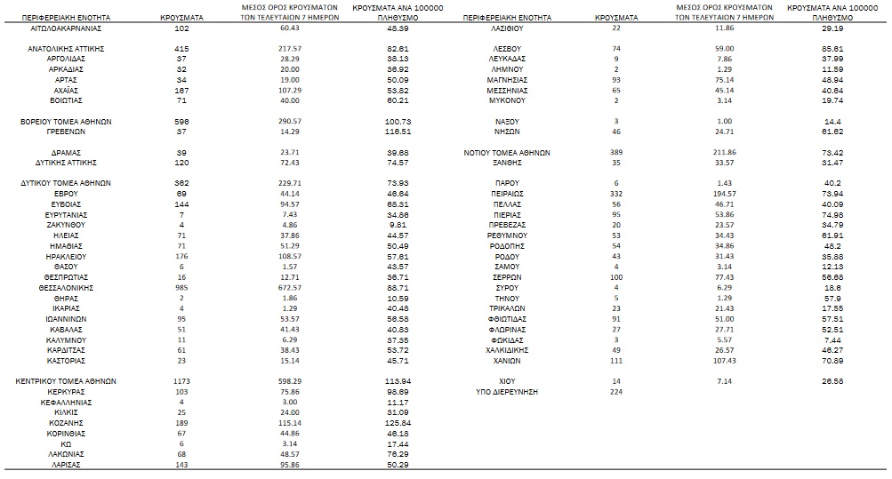 Αναλυτικά, η διασπορά των νέων κρουσμάτων ανά περιφερειακή ενότητα: