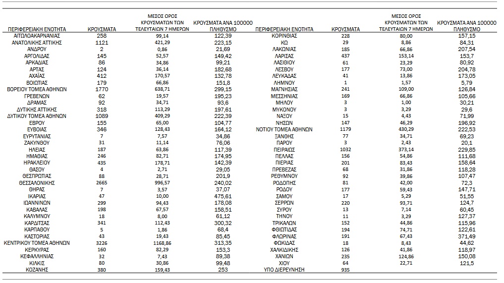 Αναλυτικά, η διασπορά των νέων κρουσμάτων ανά περιφερειακή ενότητα: