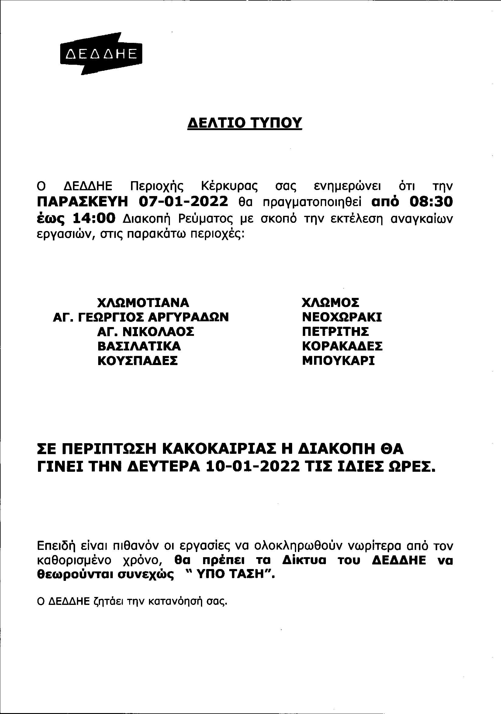 ΚΟΙΝΩΝΙΑΕΛΕΥΘΕΡΟΕΙΔΗΣΕΙΣ Νέες διακοπές ρεύματος στη Νότια Κέρκυρα Οι διακοπές ρεύματος θα πραγματοποιηθούν την Παρασκευή, λόγω εργασιών του ΔΕΔΔΗΕ Last updated: 05/10/2025 12:50 CorfuPress.com Published: 04/01/2022 Share SHARE Οι διακοπές ρεύματος θα πραγματοποιηθούν την Παρασκευή, λόγω εργασιών του ΔΕΔΔΗΕ Διακοπή ρεύματος τη Δευτέρα-Δείτε που Που θα γίνει διακοπή ρεύματος την Τετάρτη Που θα γίνει διακοπή ρεύματος την Τετάρτη Που θα γίνουν προγραμματισμένες διακοπές ρεύματος το διάστημα 23-25 Αυγούστου Έρχεται διακοπή ρεύματος στη Βόρεια Κέρκυρα Share This Article Facebook Whatsapp Whatsapp Email Copy Link Print Previous Article Ματαιώθηκε ο ο 82ος Πανελλήνιος Μαθητικός Διαγωνισμός «Ο Ευκλείδης» Next Article Γκίκας: Επιπλέον 670.000 ευρώ στους Δήμους της Κέρκυρας για τις ζημιές από το «Μπάλλο» Δεν υπάρχουν Σχόλια Δεν υπάρχουν Σχόλια Αφήστε μια απάντηση Ακύρωση απάντησηςΗ ηλ. διεύθυνση σας δεν δημοσιεύεται. Τα υποχρεωτικά πεδία σημειώνονται με *Σχόλιο * Όνομα * Email * Ιστότοπος Αποθήκευσε το όνομά μου, email, και τον ιστότοπο μου σε αυτόν τον πλοηγό για την επόμενη φορά που θα σχολιάσω. ΑναζήτησηΑναζήτησηRecent PostsΌλα τα μάτια στον Θοδωρή, τον καπετάνιο μας! Τη Δευτέρα 22 Σεπτεμβρίου γιορτάζει… Σαν Σήμερα 22/9: Τα σημαντικότερα γεγονότα… Η πρόγνωση του καιρού Έφηβοι Ιονίου: Με περίπατο, συνεχίζουν στο Rising Stars! Recent CommentsΧωρίς σχόλια για εμφάνιση.