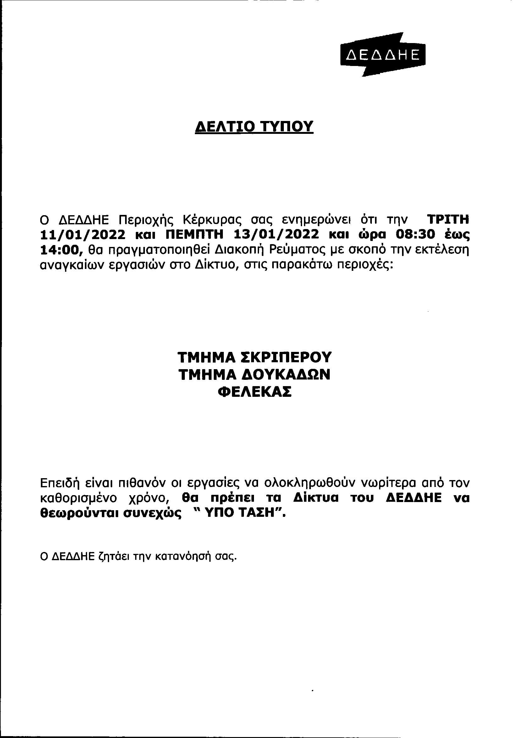 ΚΟΙΝΩΝΙΑΕΛΕΥΘΕΡΟΕΙΔΗΣΕΙΣ Νέες διακοπές ρεύματος την Τρίτη και την Πέμπτη Αιτία των διακοπών είναι οι εργασίες που θα πραγματοποιήσει ο ΔΕΔΔΗΕ. Last updated: 07/01/2022 15:35 CorfuPress.com Published: 07/01/2022 Share SHARE Αιτία των διακοπών είναι οι εργασίες που θα πραγματοποιήσει ο ΔΕΔΔΗΕ. Διακοπή ρεύματος τη Δευτέρα-Δείτε που Που θα γίνει διακοπή ρεύματος την Τετάρτη Που θα γίνει διακοπή ρεύματος την Τετάρτη Επιστολή Επιμελητηρίου προς ΔΕΔΔΗΕ για τις πολύωρες διακοπές ρεύματος Που θα γίνουν προγραμματισμένες διακοπές ρεύματος το διάστημα 23-25 Αυγούστου Share This Article Facebook Whatsapp Whatsapp Email Copy Link Print Previous Article Πόσιμο νερό από τη βρύση στην πόλη σε τρία χρόνια Next Article Συγκροτήθηκε σε σώμα το νέο ΔΣ του Δικηγορικού Συλλόγου Δεν υπάρχουν Σχόλια Δεν υπάρχουν Σχόλια Αφήστε μια απάντηση Ακύρωση απάντησηςΗ ηλ. διεύθυνση σας δεν δημοσιεύεται. Τα υποχρεωτικά πεδία σημειώνονται με *Σχόλιο * Όνομα * Email * Ιστότοπος Αποθήκευσε το όνομά μου, email, και τον ιστότοπο μου σε αυτόν τον πλοηγό για την επόμενη φορά που θα σχολιάσω. ΑναζήτησηΑναζήτησηRecent PostsΌλα τα μάτια στον Θοδωρή, τον καπετάνιο μας! Τη Δευτέρα 22 Σεπτεμβρίου γιορτάζει… Σαν Σήμερα 22/9: Τα σημαντικότερα γεγονότα… Η πρόγνωση του καιρού Έφηβοι Ιονίου: Με περίπατο, συνεχίζουν στο Rising Stars! Recent CommentsΧωρίς σχόλια για εμφάνιση.