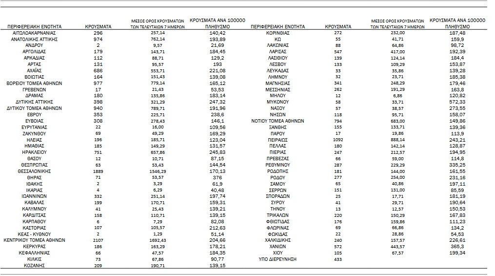 Αναλυτικά, η διασπορά των νέων κρουσμάτων ανά περιφερειακή ενότητα: