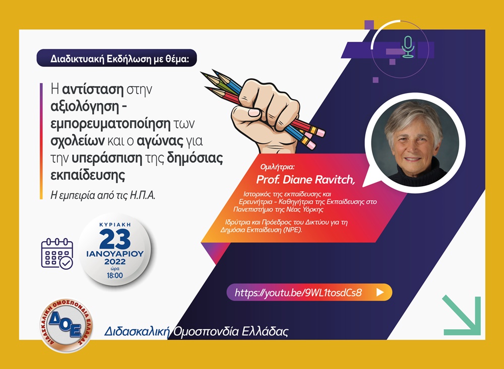 Η Δ.Ο.Ε. πραγματοποιεί την Κυριακή 23 Ιανουαρίου, στις 6:00 μ.μ. διαδικτυακή εκδήλωση, με ομιλήτρια την Diane Ravitch, καθηγήτρια στο Πανεπιστήμιο της Νέας Υόρκης, ιστορικό της εκπαίδευσης και ερευνήτρια εκπαιδευτικής πολιτικής. Τίτλος της εκδήλωσης: