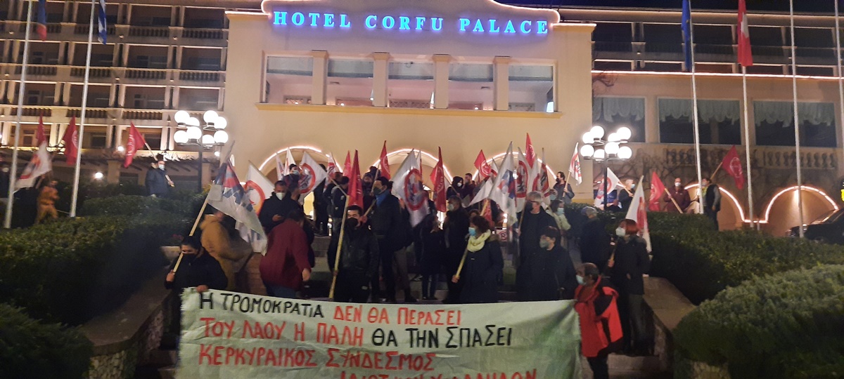 Το Εργατικό Κέντρο Κέρκυρας πραγματοποίησε την Παρασκευή το βράδυ, κινητοποίηση μπροστά στο Καζίνο της Κέρκυρας, την ίδια ώρα που πραγματοποιούνταν κινητοποίηση και στο Καζίνο του Ρίου.