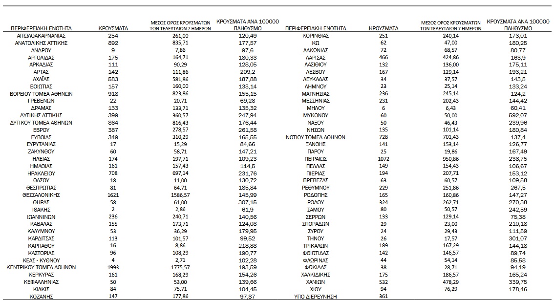 Αναλυτικά, η διασπορά των νέων κρουσμάτων ανά περιφερειακή ενότητα: