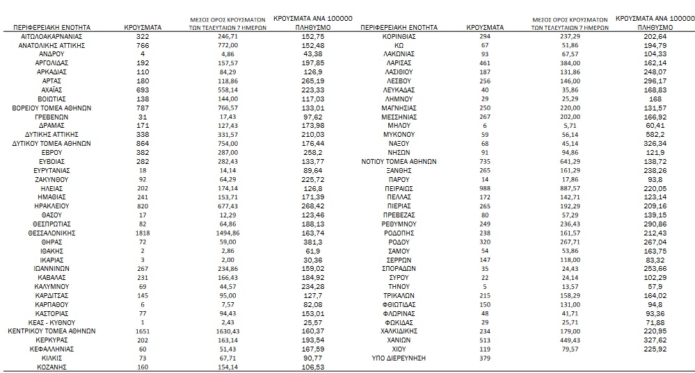 Αναλυτικά, η διασπορά των νέων κρουσμάτων ανά περιφερειακή ενότητα: