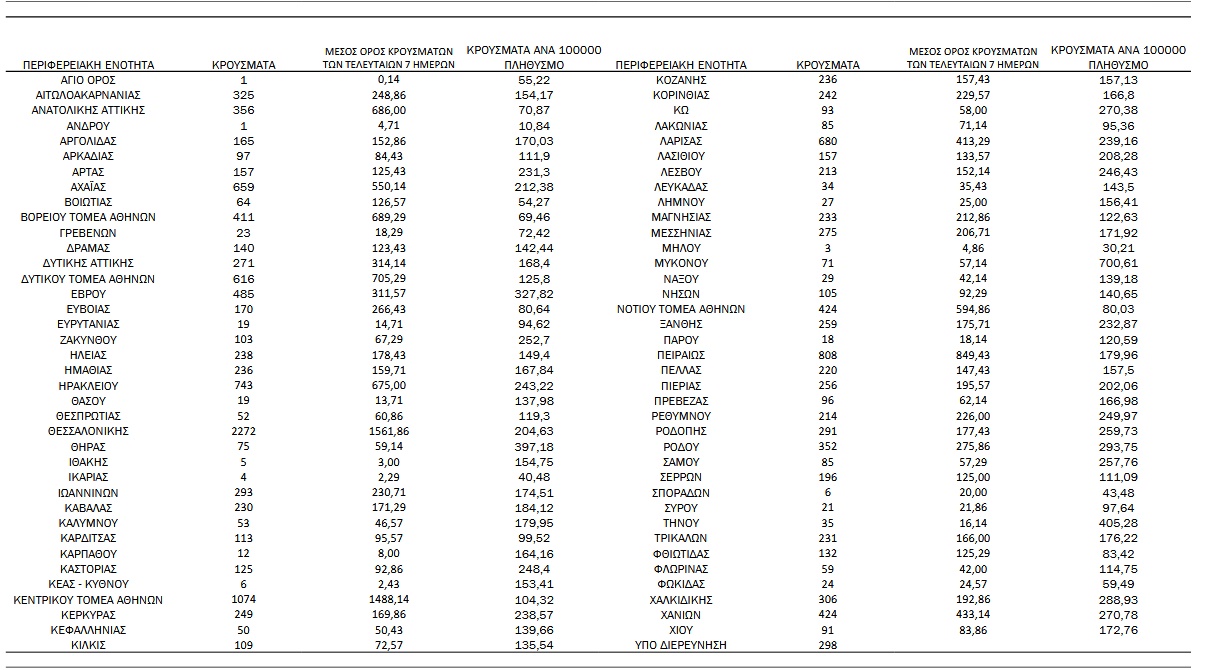 Αναλυτικά, η διασπορά των νέων κρουσμάτων ανά περιφερειακή ενότητα:
