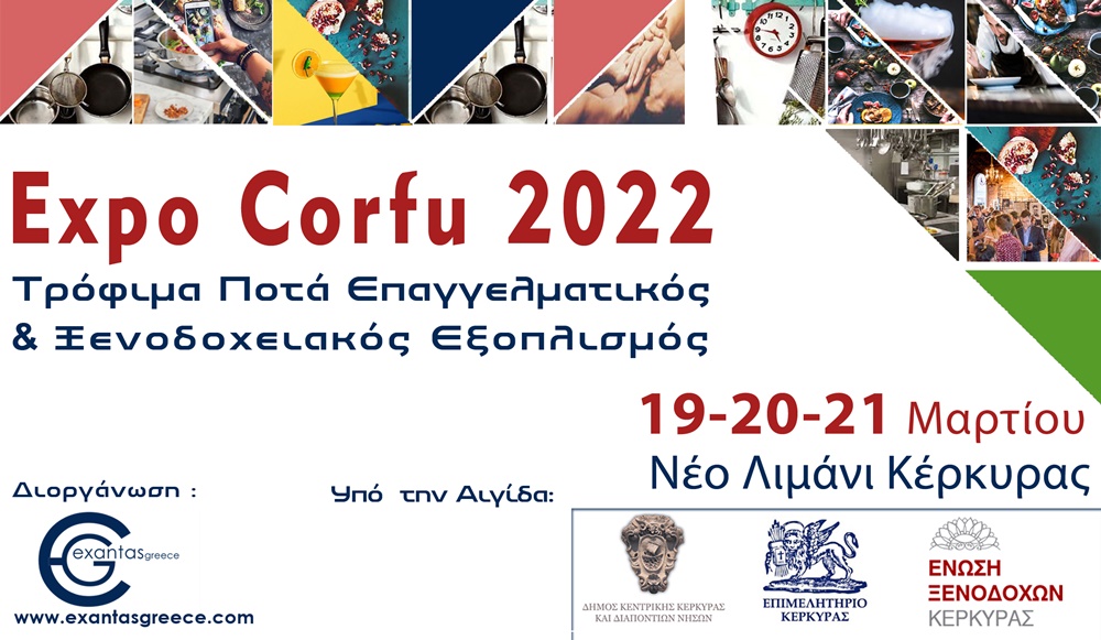 Στις 19 – 20 – 21 Μαρτίου 2022 στο Νέο Λιμάνι Κέρκυρας, στον επιβατικό σταθμό εξωτερικού, πρόκειται να διεξαχθεί η EXPO CORFU – Τρόφιμα, Ποτά, Επαγγελματικός & Ξενοδοχειακός εξοπλισμός με διοργανωτή την ExantasGreece www.exantasgreece.com, η οποία είχε αναβληθεί λόγω Covid–19.