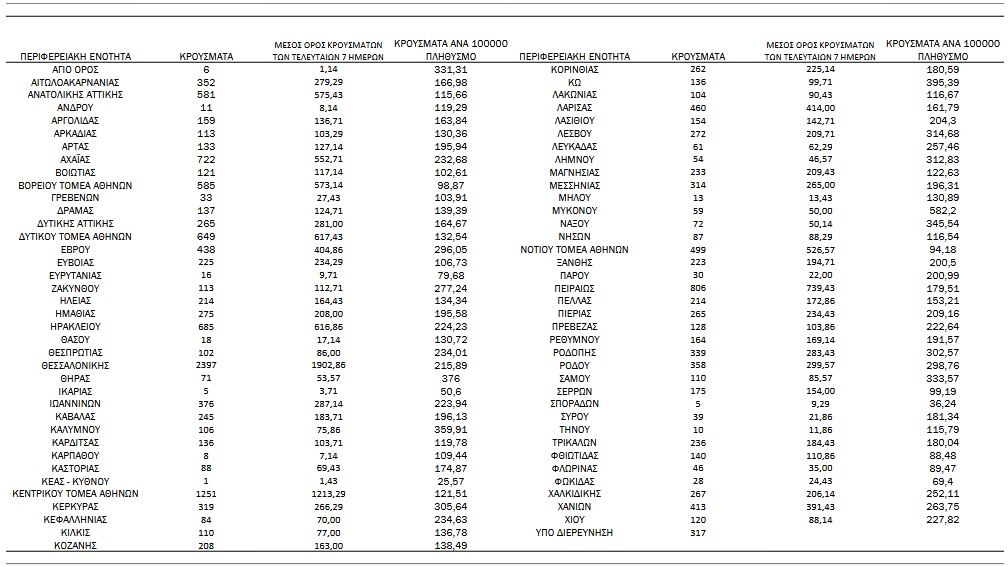 Αναλυτικά, η διασπορά των νέων κρουσμάτων ανά περιφερειακή ενότητα: