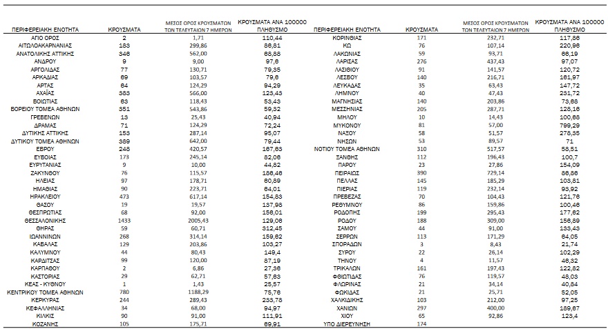 Αναλυτικά, η διασπορά των νέων κρουσμάτων ανά περιφερειακή ενότητα: