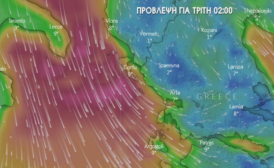 Σύμφωνα με την πρόγνωση της ΕΜΥ, οι θυελλώδεις βορειοδυτικοί άνεμοι θα επικρατήσουν από τις βραδινές ώρες με ένταση που θα ξεπερνά με ριπές ακόμα και τα 8 με 9 μποφόρ. Παράλληλα, βροχές και καταιγίδες κατά τόπους ισχυρές θα εκδηλωθούν από το απόγευμα στο βόρειο Ιόνιο και την Ήπειρο. Την Τρίτη, σε όλη τη χώρα θα πνέουν θυελλώδεις βόρειοι βορειοδυτικοί άνεμοι εντάσεως 8 με 10 μποφόρ ενώ στην περιοχή μας θα εξασθενήσουν από το απόγευμα.