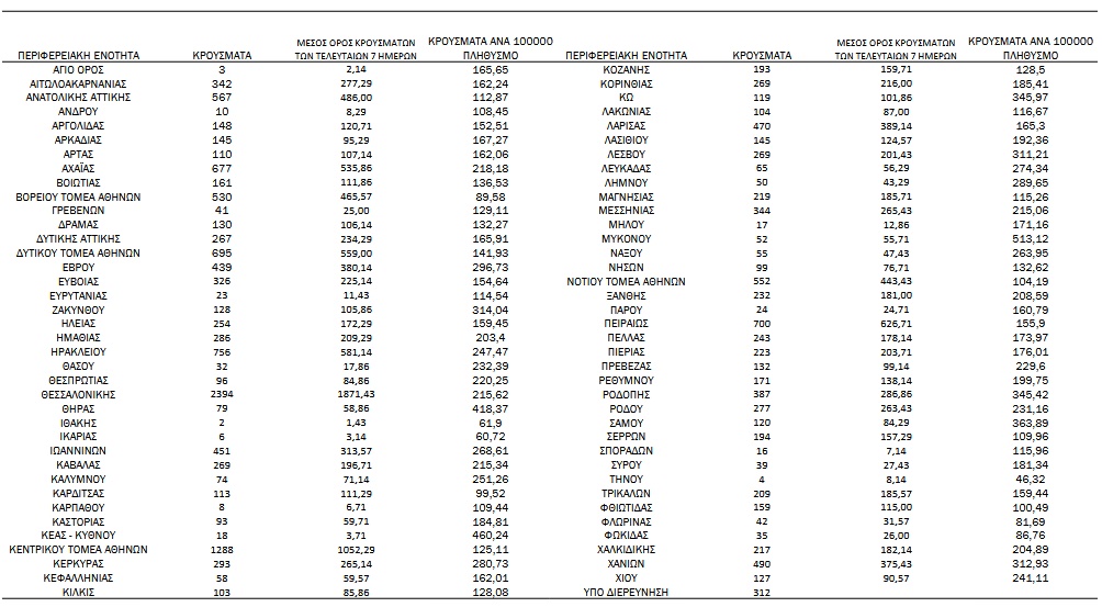 Αναλυτικά, η διασπορά των νέων κρουσμάτων ανά περιφερειακή ενότητα:
