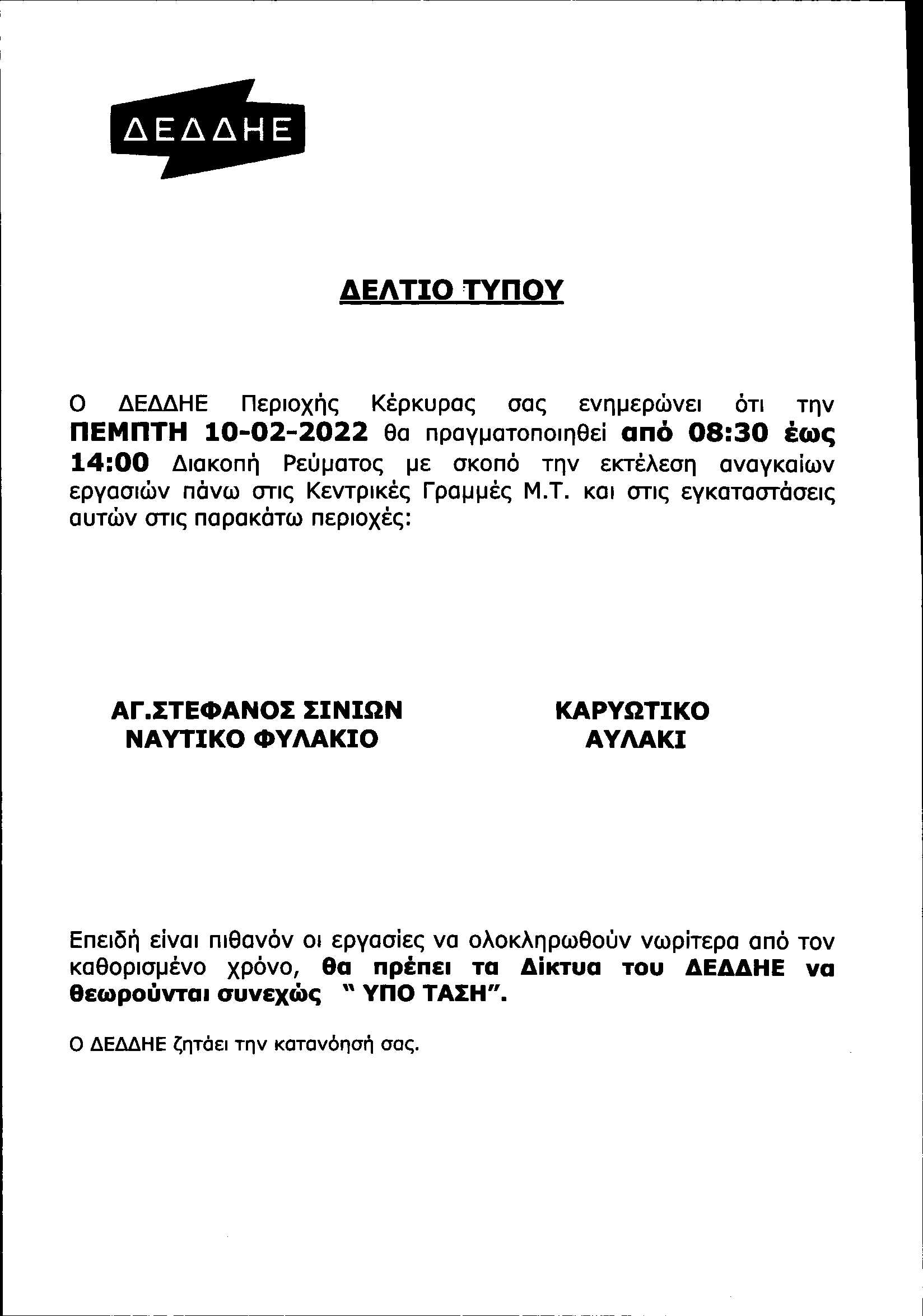 ΚΟΙΝΩΝΙΑΕΛΕΥΘΕΡΟΕΙΔΗΣΕΙΣ Διακοπή ρεύματος την Πέμπτη στο βορρά Αιτία της διακοπής οι εργασίες που θα πραγματοποιήσει ο ΔΕΔΔΗΕ. Last updated: 05/10/2025 13:18 CorfuPress.com Published: 08/02/2022 Share SHARE Αιτία της διακοπής οι εργασίες που θα πραγματοποιήσει ο ΔΕΔΔΗΕ. Έρχεται διακοπή ρεύματος στο Βορρά Έκτακτη διακοπή ρεύματος την Παρασκευή – Δείτε που Διακοπή ρεύματος την Τετάρτη, δείτε που Τρίωρη διακοπή ρεύματος την Κυριακή Τη Δευτέρα, διακοπή ρεύματος στο βορρά Share This Article Facebook Whatsapp Whatsapp Email Copy Link Print Previous Article Επίσκεψη Τσακίρη στα γραφεία του ΕΦΕΠΑΕ Next Article Αυλωνίτης: Τεράστια τα προβλήματα των Κερκυραίων αγροτών, η κυβέρνηση σε ρόλο θεατή Δεν υπάρχουν Σχόλια Δεν υπάρχουν Σχόλια Αφήστε μια απάντηση Ακύρωση απάντησηςΗ ηλ. διεύθυνση σας δεν δημοσιεύεται. Τα υποχρεωτικά πεδία σημειώνονται με *Σχόλιο * Όνομα * Email * Ιστότοπος Αποθήκευσε το όνομά μου, email, και τον ιστότοπο μου σε αυτόν τον πλοηγό για την επόμενη φορά που θα σχολιάσω. ΑναζήτησηΑναζήτησηRecent PostsΌλα τα μάτια στον Θοδωρή, τον καπετάνιο μας! Τη Δευτέρα 22 Σεπτεμβρίου γιορτάζει… Σαν Σήμερα 22/9: Τα σημαντικότερα γεγονότα… Η πρόγνωση του καιρού Έφηβοι Ιονίου: Με περίπατο, συνεχίζουν στο Rising Stars! Recent CommentsΧωρίς σχόλια για εμφάνιση.