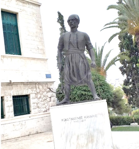 Στο νοτιοανατολικό άκρο του μεγάλου ανοικτού χώρου όπου γίνονται οι επίσημες τελετές της Σχολής των Ναυτικών Δοκίμων και που ακούει στο όνομα Πλατεία Ελευθερίας, δεσπόζει ο ανδριάντας του Κωνσταντίνου Κανάρη (Ψαρά, 1793 ή 1795 – Αθήνα, 1877), μιας από τις πλέον εμβληματικές και ένδοξες ναυτικές μορφές του Αγώνα του 1821. Το έργο φιλοτεχνείται το 1990 σε γύψο από το γλύπτη Στέλιο Τριάντη, μεταφέρεται στη συνέχεια σε χαλκό και τοποθετείται αμέσως μετά στο προαναφερθέν σημείο της εν λόγω Σχολής. Πανομοιότυπο αντίγραφο του γλυπτού στήνεται στα Τρίκαλα, στη Θεσσαλία, το 1992, στο πλαίσιο του εορτασμού της ναυτικής εβδομάδας.