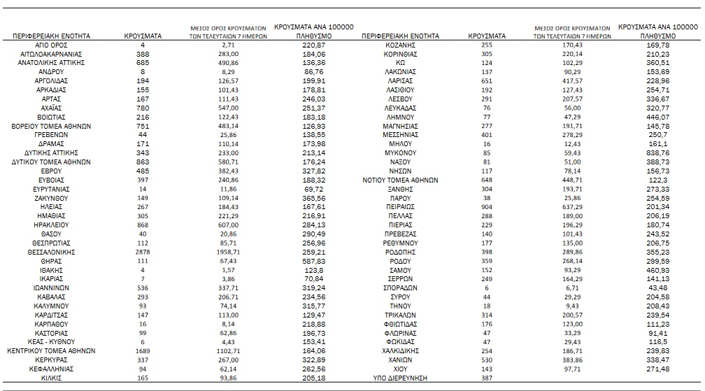 Αναλυτικά, η διασπορά των νέων κρουσμάτων ανά περιφερειακή ενότητα: