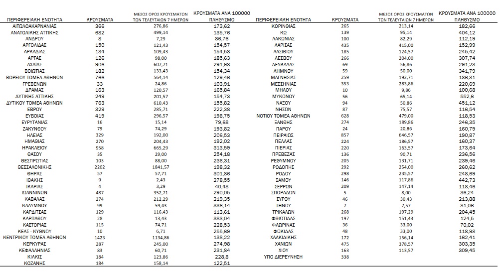 Αναλυτικά, η διασπορά των νέων κρουσμάτων ανά περιφερειακή ενότητα: