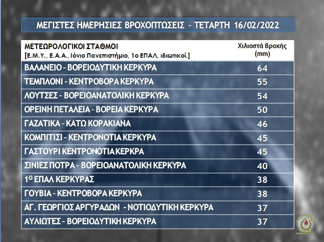 Σύμφωνα με το δίκτυο αυτόματων μετεωρολογικών σταθμών Κέρκυρας & Παξών [ΕΜΥ, ΕΑΑ, 1ο ΕΠΑΛ Κέρκυρας, Ιόνιο Πανεπιστήμιο, & ιδιωτικοί] Βροχοπτώσεις, χαλαζοπτώσεις και σποραδικές καταιγίδες εκδηλώνονται από το πρωί της Τέταρτης 16/02 σε αρκετές περιοχές του νομού, με τα μεγαλύτερα ύψη ημερήσια βροχόπτωσης που έχουν καταγράψει οι σταθμοί μας στα βορειοτέρα τμήματα.