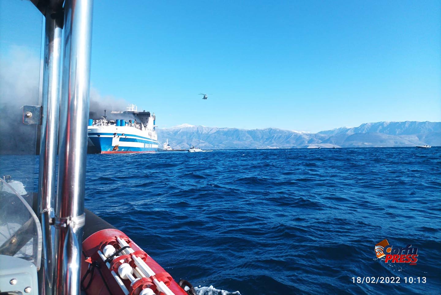 Εντυπωσιακή εικόνα μπροστά από το φλεγόμενο πλοίο ανήρτησαν τα μέλη της Ελληνικής Ομάδας Διάσωσης Κέρκυρας, τα οποία βρίσκονται στο θαλάσσιο σημείο ανοικτά της Ερείκουσας για να συμβάλλουν στην επιχείρηση διάσωσης.