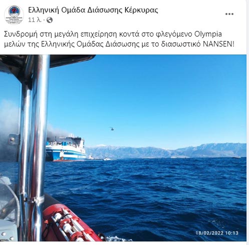 Όπως αναφέρουν στην ανάρτησή τους: «Συνδρομή στη μεγάλη επιχείρηση κοντά στο φλεγόμενο Olympia μελών της Ελληνικής Ομάδας Διάσωσης με το διασωστικό NANSEN!»