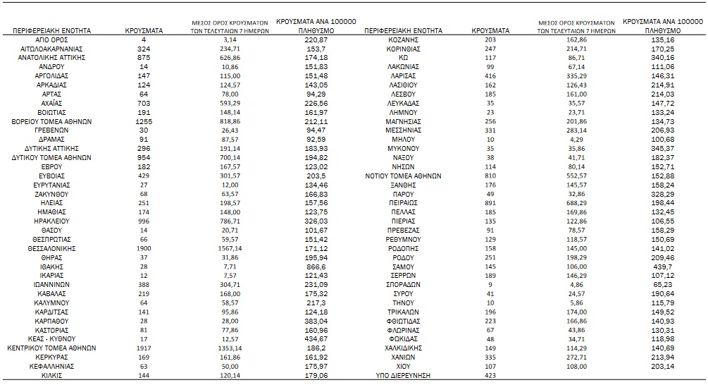 Αναλυτικά, η διασπορά των νέων κρουσμάτων ανά περιφερειακή ενότητα: