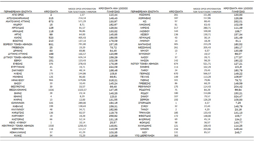 Αναλυτικά, η διασπορά των νέων κρουσμάτων ανά περιφερειακή ενότητα: