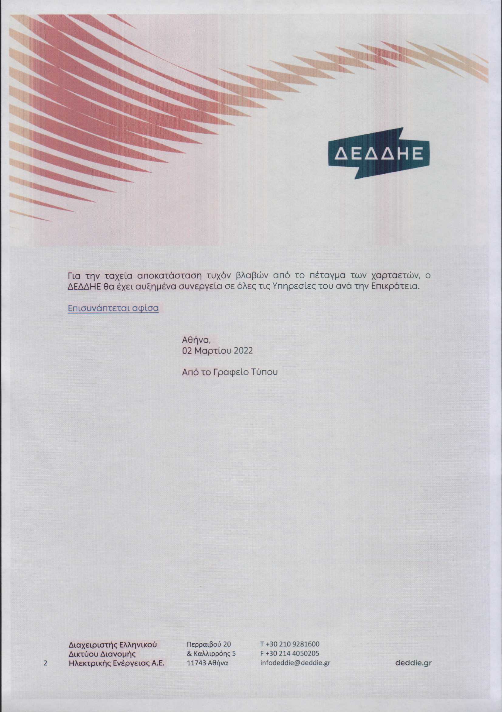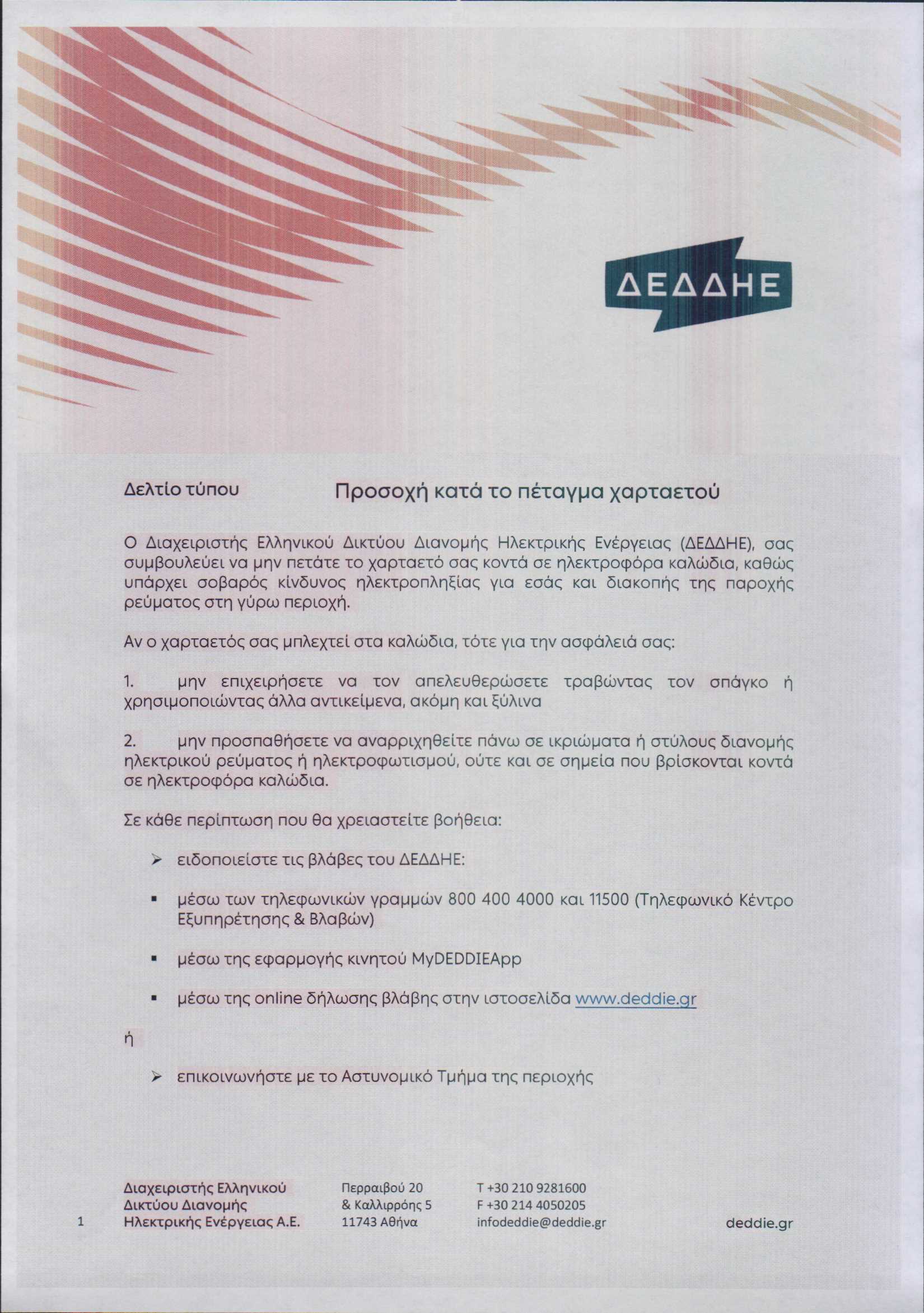 ΚΟΙΝΩΝΙΑΕΛΕΥΘΕΡΟΕΙΔΗΣΕΙΣ ΔΕΔΔΗΕ: Προσοχή κατά το πέταγμα του χαρταετού Φυλλάδιο οδηγιών από τον ΔΕΔΔΗΕ για όσους πετάξουν χαρταετό την Καθαρά Δευτέρα. Last updated: 04/03/2022 14:03 CorfuPress.com Published: 04/03/2022 Share SHARE Φυλλάδιο οδηγιών από τον ΔΕΔΔΗΕ για όσους πετάξουν χαρταετό την Καθαρά Δευτέρα. Διακοπή ρεύματος τη Δευτέρα-Δείτε που Που θα γίνει διακοπή ρεύματος την Τετάρτη Που θα γίνει διακοπή ρεύματος την Τετάρτη Επιστολή Επιμελητηρίου προς ΔΕΔΔΗΕ για τις πολύωρες διακοπές ρεύματος Που θα γίνουν προγραμματισμένες διακοπές ρεύματος το διάστημα 23-25 Αυγούστου Share This Article Facebook Whatsapp Whatsapp Email Copy Link Print Previous Article Δημιουργία σωματειακής επιτροπής εργαζομένων οδηγών μεταφορών και διανομών Next Article Σύλληψη για καταδικαστική απόφαση στη Ζάκυνθο Δεν υπάρχουν Σχόλια Δεν υπάρχουν Σχόλια Αφήστε μια απάντηση Ακύρωση απάντησηςΗ ηλ. διεύθυνση σας δεν δημοσιεύεται. Τα υποχρεωτικά πεδία σημειώνονται με *Σχόλιο * Όνομα * Email * Ιστότοπος Αποθήκευσε το όνομά μου, email, και τον ιστότοπο μου σε αυτόν τον πλοηγό για την επόμενη φορά που θα σχολιάσω. ΑναζήτησηΑναζήτησηRecent PostsΌλα τα μάτια στον Θοδωρή, τον καπετάνιο μας! Τη Δευτέρα 22 Σεπτεμβρίου γιορτάζει… Σαν Σήμερα 22/9: Τα σημαντικότερα γεγονότα… Η πρόγνωση του καιρού Έφηβοι Ιονίου: Με περίπατο, συνεχίζουν στο Rising Stars! Recent CommentsΧωρίς σχόλια για εμφάνιση.