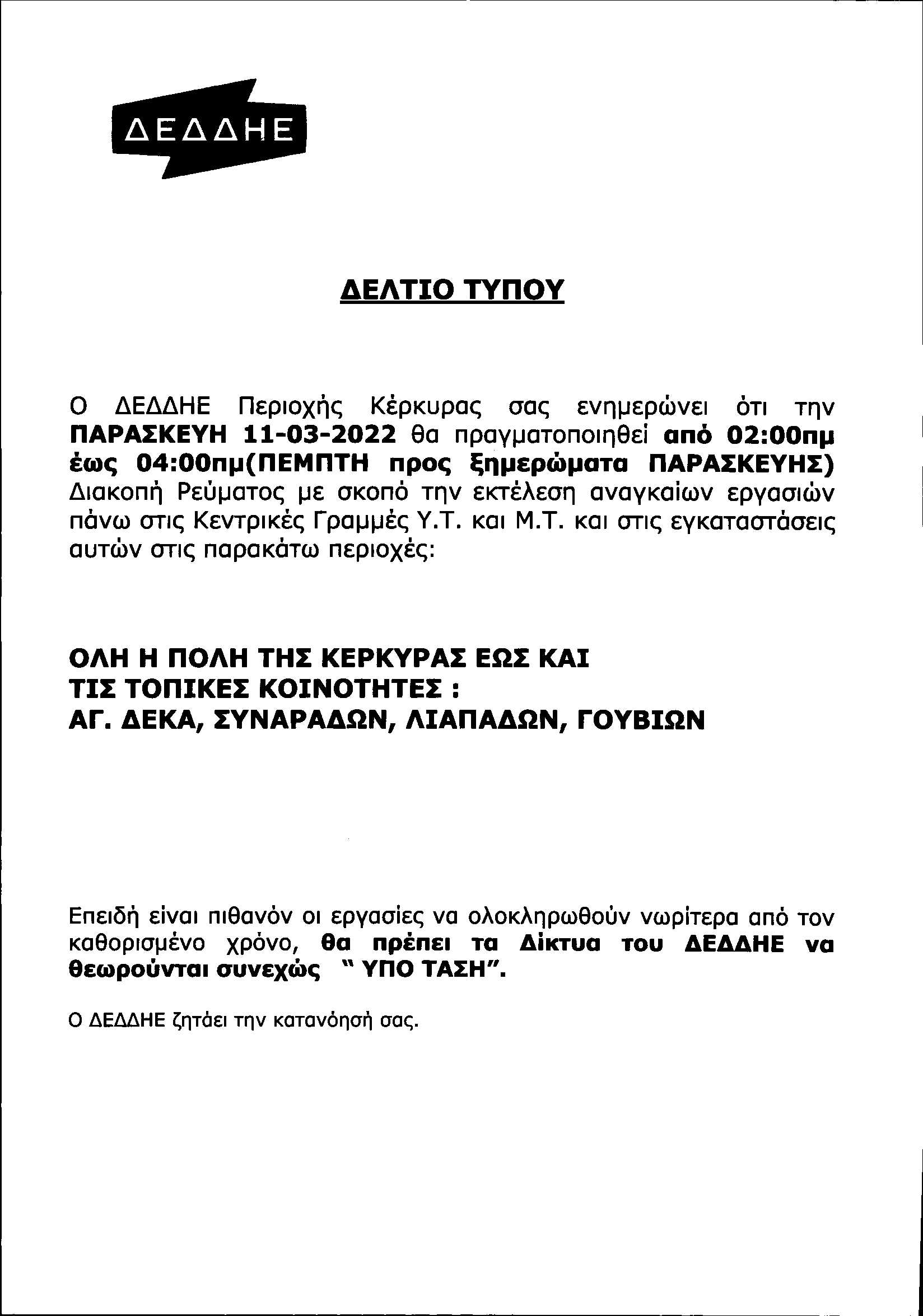 ΚΟΙΝΩΝΙΑΕΛΕΥΘΕΡΟΕΙΔΗΣΕΙΣ Διακοπή ρεύματος σε όλη την πόλη (κι όχι μόνο) το ξημέρωμα Παρασκευής Ο ΔΕΔΔΗΕ πρόκειται να πραγματοποιήσει εργασίες στις κεντρικές γραμμές Μεσαίας και Υψηλής Τάσης. Last updated: 09/03/2022 15:38 CorfuPress.com Published: 09/03/2022 Share SHARE Ο ΔΕΔΔΗΕ πρόκειται να πραγματοποιήσει εργασίες στις κεντρικές γραμμές Μεσαίας και Υψηλής Τάσης. Διακοπή ρεύματος τη Δευτέρα-Δείτε που Που θα γίνει διακοπή ρεύματος την Τετάρτη Που θα γίνει διακοπή ρεύματος την Τετάρτη Που θα γίνουν προγραμματισμένες διακοπές ρεύματος το διάστημα 23-25 Αυγούστου Έρχεται διακοπή ρεύματος στη Βόρεια Κέρκυρα Share This Article Facebook Whatsapp Whatsapp Email Copy Link Print Previous Article Ενημέρωση για τις έγγραφες μαθητών σε νηπιαγωγείο και α΄δημοτικού Next Article Σύλλογος Γονέων ΑμεΑ: Αόρατες οι γυναίκες με αναπηρία στην εκδήλωση του δήμο Δεν υπάρχουν Σχόλια Δεν υπάρχουν Σχόλια Αφήστε μια απάντηση Ακύρωση απάντησηςΗ ηλ. διεύθυνση σας δεν δημοσιεύεται. Τα υποχρεωτικά πεδία σημειώνονται με *Σχόλιο * Όνομα * Email * Ιστότοπος Αποθήκευσε το όνομά μου, email, και τον ιστότοπο μου σε αυτόν τον πλοηγό για την επόμενη φορά που θα σχολιάσω. ΑναζήτησηΑναζήτησηRecent PostsΌλα τα μάτια στον Θοδωρή, τον καπετάνιο μας! Τη Δευτέρα 22 Σεπτεμβρίου γιορτάζει… Σαν Σήμερα 22/9: Τα σημαντικότερα γεγονότα… Η πρόγνωση του καιρού Έφηβοι Ιονίου: Με περίπατο, συνεχίζουν στο Rising Stars! Recent CommentsΧωρίς σχόλια για εμφάνιση.