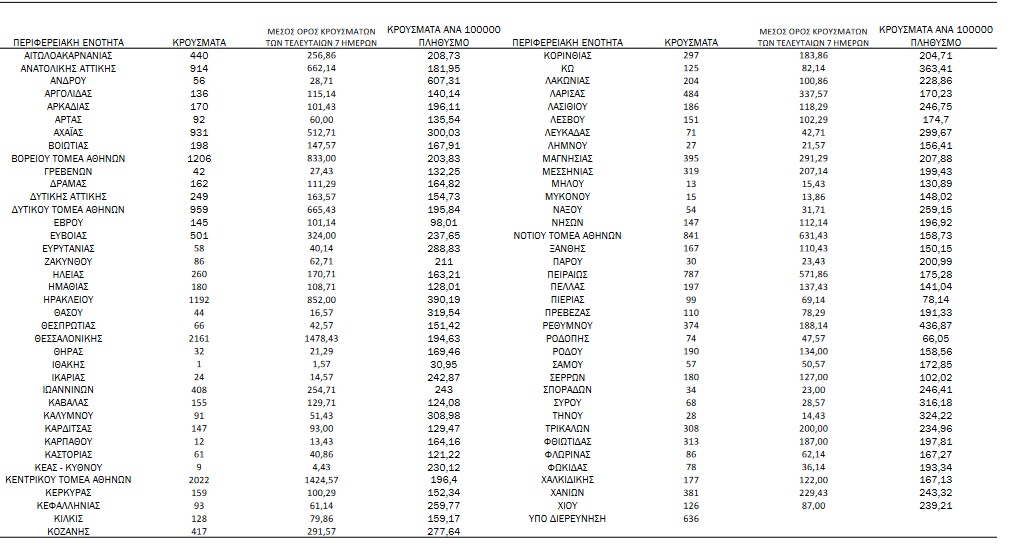 Αναλυτικά, η διασπορά των νέων κρουσμάτων ανά περιφερειακή ενότητα: