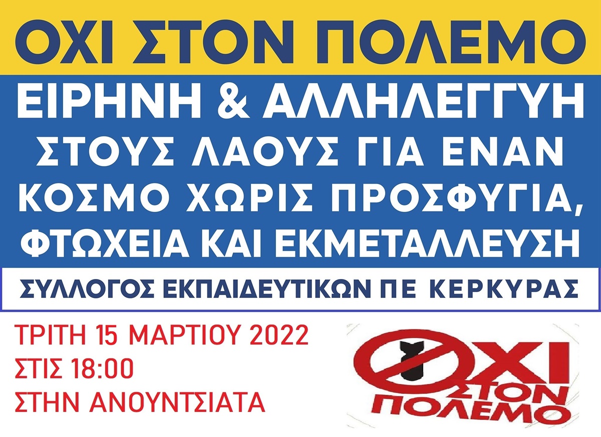 Τους εκπαιδευτικούς, τον λαό της Κέρκυρας, τα συνδικάτα του δημόσιου και ιδιωτικού τομέα στο αντιπολεμικό συλλαλητήριο, την Τρίτη 15 Μαρτίου, στις 6:00 μ.μ. στην Ανουντσιάτα.